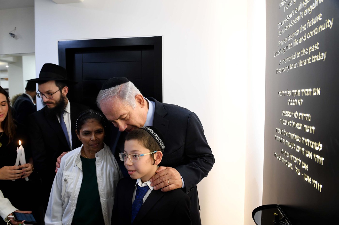 מוישי הצליח לרגש את הנוכחים כאשר אמר: "אני רוצה להודות להקב"ה בשם ומלכות", ובירך את ברכת "ברוך שעשה לי נס במקום הזה". לאחר מכן העניק לנתניהו דגם של יריעת ספר התורה שנמצאה במקום לאחר הטבח, כשהמילים "אחרי מות קדושים" מחוררות מכדורי המחבלים.