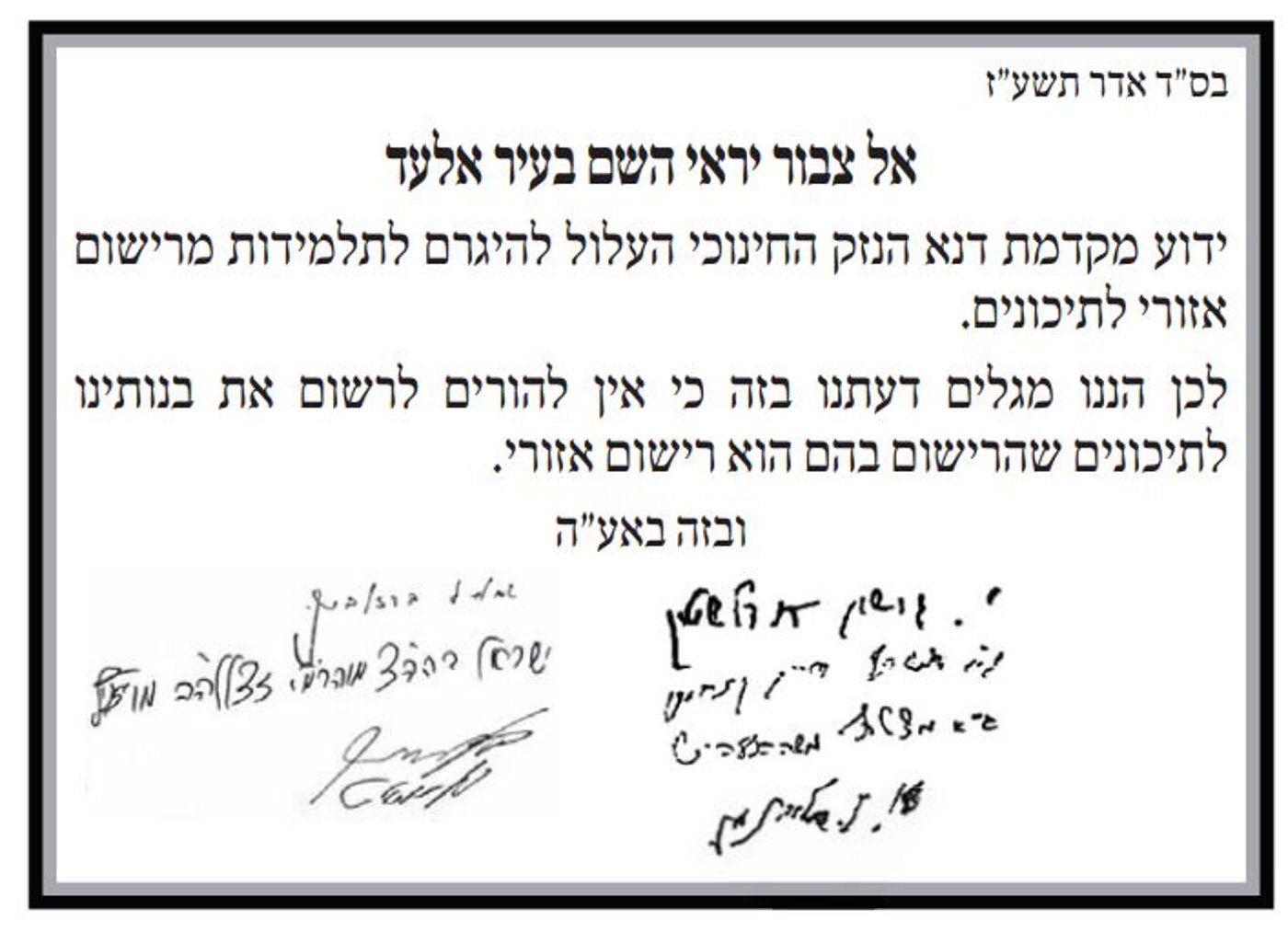 אך עמוד אחרי פרסום העירייה, פורסם מכתבם של גדולי ישראל, בראשות ראש הישיבה הגאון רבי גרשון אדלשטיין, המתנגדים לרישום בשיטת הרישום אזורי: "ידוע מקדמת דנא הנזק החינוכי העלול להיגרם לתלמידות מרישום אזורי לתיכונים. לכן הננו מגלים דעתנו בזה כי אין להורים לרשום את בנותינו לתיכונים שהרישום בהם הוא רישום אזורי".