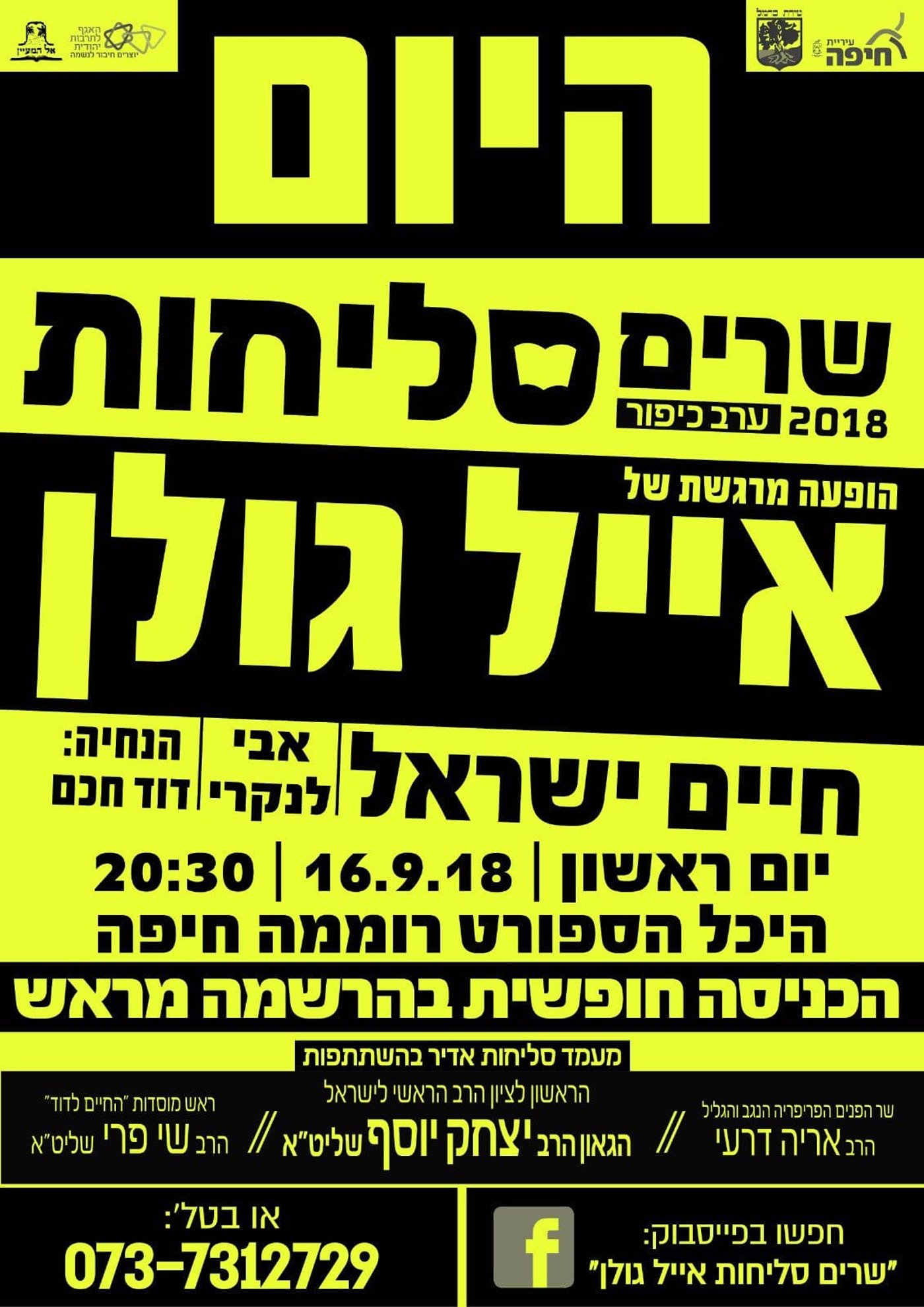 בהיכל הספורט רוממה בחיפה ייערך הערב (ראשון) מעמד סליחות גדול בהשתתפות הראשון לציון הגאון רבי יצחק יוסף, הגאון רבי שי פרי ויו"ר ש"ס אריה דרעי, כאשר במקום יופיעו הזמרים אייל גולן וחיים ישראל. אלא שמנגד הודיע "הרב" הרפורמי דובי חיון כי יפגין עם אנשי מרצ נגד האירוע.
