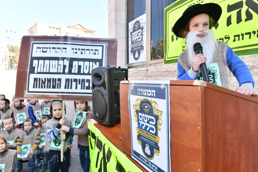 מאות ילדי חיידר סאטמר בבני ברק, הפכו היום (רביעי) לרגע למפגינים נלהבים נגד "הבחירות לכנסת המינים".