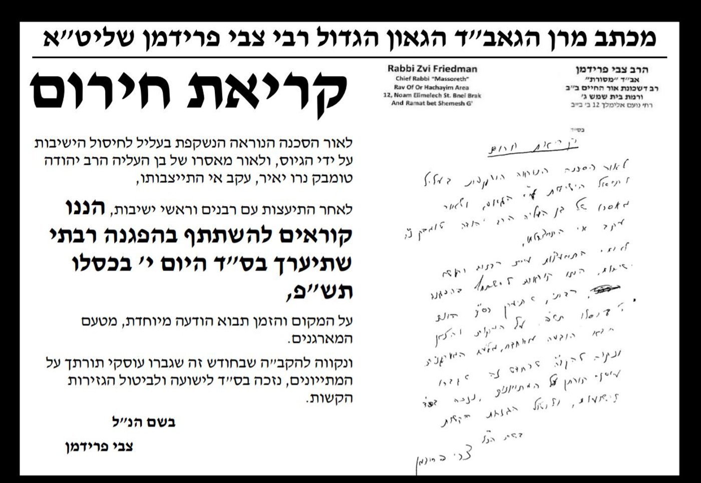 כפי שפורסם ב'כיכר השבת' בסוף השבוע, הגר"צ פרידמן אמר כי "בני התורה חייבים להביע את מחאתם על המעצר הנפשע של האברך בן העלייה".