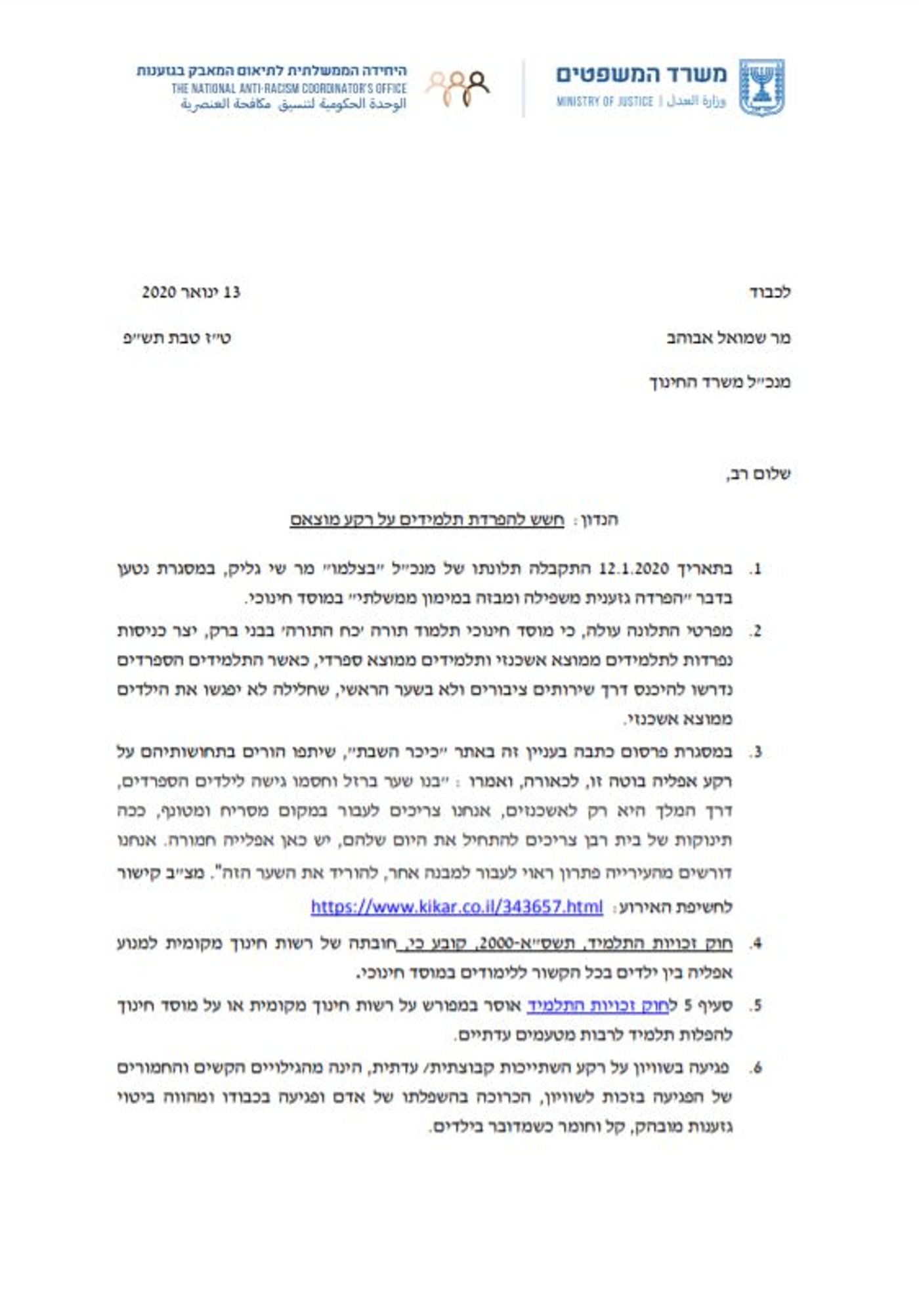 ההפרדה המקוממת והמשפילה, בין תלמידים ספרדים לתלמידים אשכנזים, בבניין תלמודי התורה 'כח התורה' ו'אילת השחר' בבני ברק, כאשר הספרדים אולצו לעבור דרך השירותים - כפי שנחשף ב'כיכר השבת', הובילה להתערבות של היחידה הממשלתית לתיאום המאבק בגזענות במשרד המשפטים, שפנתה במכתב למנכ"ל משרד החינוך.