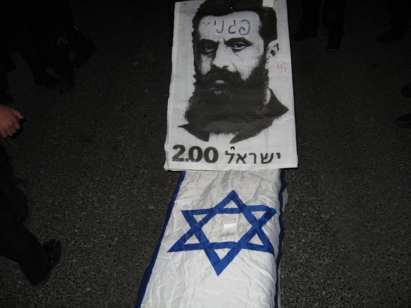 תמונת הרצל שעליה נכתב "פגאני" הועלתה אמש יחד עם דגל ישראל בלהבות, בהפגנה שנערכה במאה שערים נגד חילולי הקברים. צפו (צילומים: יוסי פוקס - סוכנות הידיעות "חדשות 24")