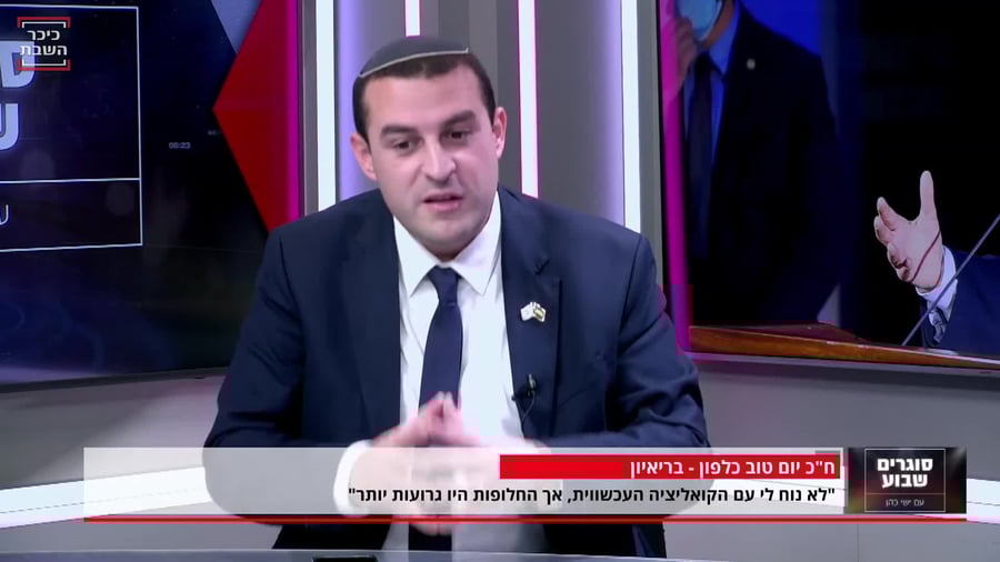 ח"כ יום טוב כלפון מ'ימינה' התארח לריאיון באולפן 'כיכר השבת', ריאיון שהתפתח לעימות על חוקי דת ומדינה שמעבירה סיעתו, בזמן שהוא מצהיר כי הרבנות היא הקובעת. הריאיון המלא, הערב בתוכנית 'סוגרים שבוע עם ישי כהן'.