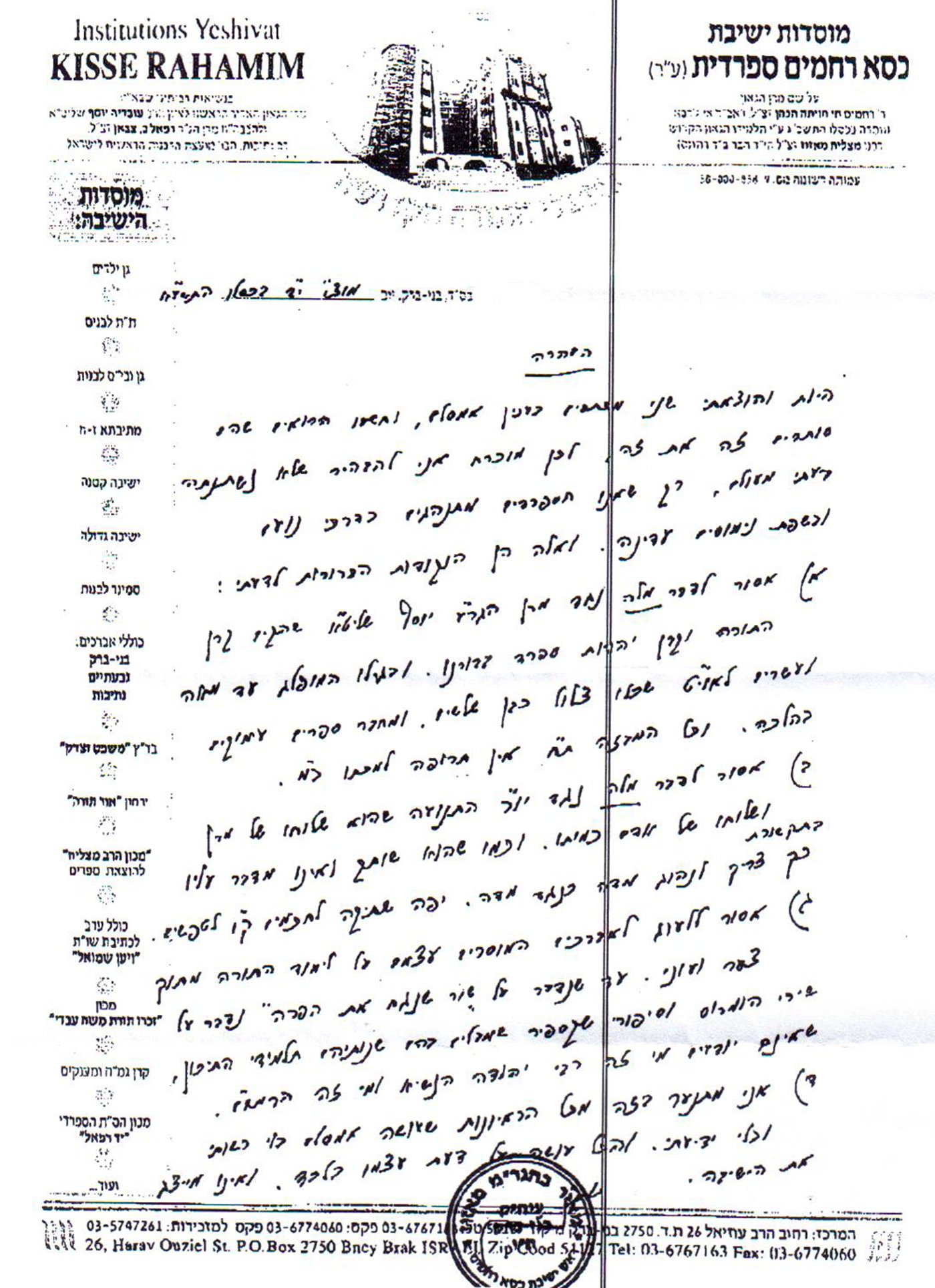 "הציבור יבוא חשבון, בבוא העת, עם אותם האנשים צרי האינטרסים וחסרי המוסר, שהפכו את מרן גדול הדור לקרדום לחפור בו. ולגבי המכתב של הגר"מ מאזוז: את אותם הפטנטים המרושעים, חסרי הכבוד, הדיקטטוריים, הנפשעים והחצופים, שהם עושים על מרן הגר"ע יוסף הם מעתיקים