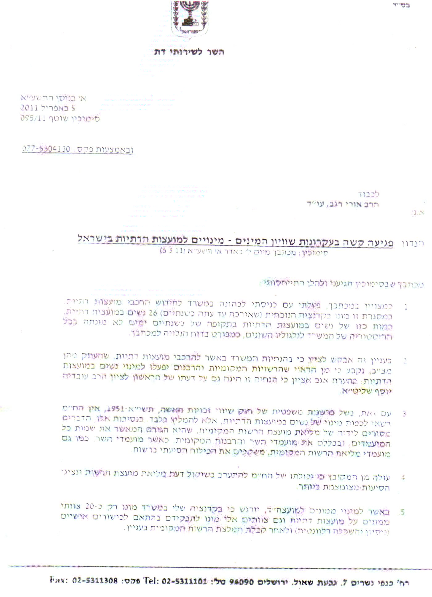 במכתב המסעיר כותב השר מרגי: "אבקש לציין כי בהנחיות המשרד באשר להרכבי מועצות דתיות... נקבע כי מן הראוי שהרשויות המקומיות והרבנים יפעלו למינוי נשים במועצות הדתיות. בהערת אגב אציין כי הנחיה זו הינה גם על דעתו של הראשון-לציון הרב עובדיה יוסף שליט"א".