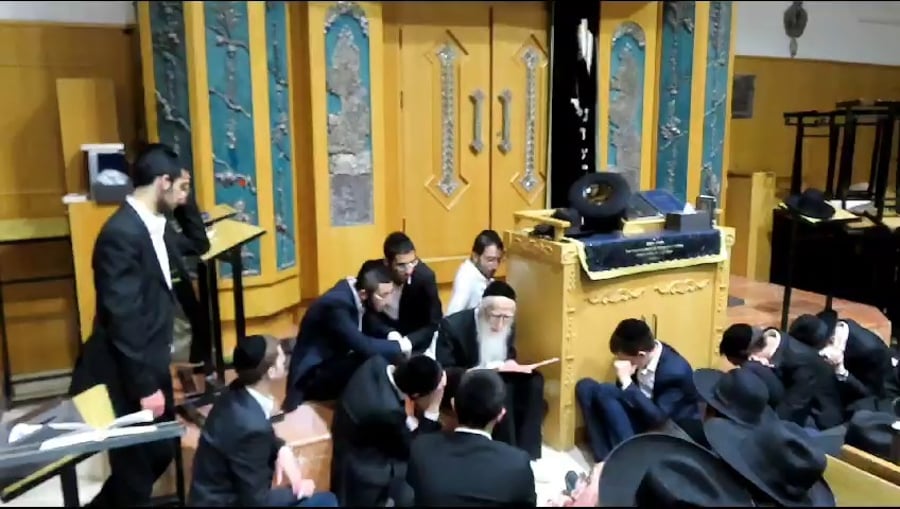ראש הישיבה, הגאון רבי יהודה כהן, חבר מועצת חכמי התורה, בקריאת הקינות על חורבן הבית, כשהוא מוקף בתלמידיו בהיכל ישיבת 'יקירי ירושלים' | תיעוד (חרדים)