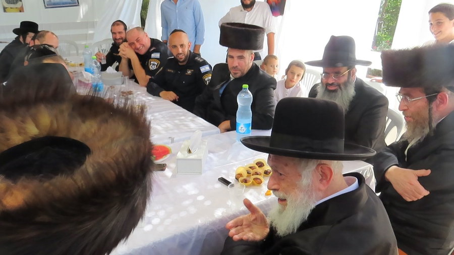בכירי פיקוד מרחב דן במשטרה, עלו (היום) לביקור חג מיוחד בסוכתו של עמוד ההוראה הגאון רבי יצחק זילברשטיין, בביתו ברמת חן.