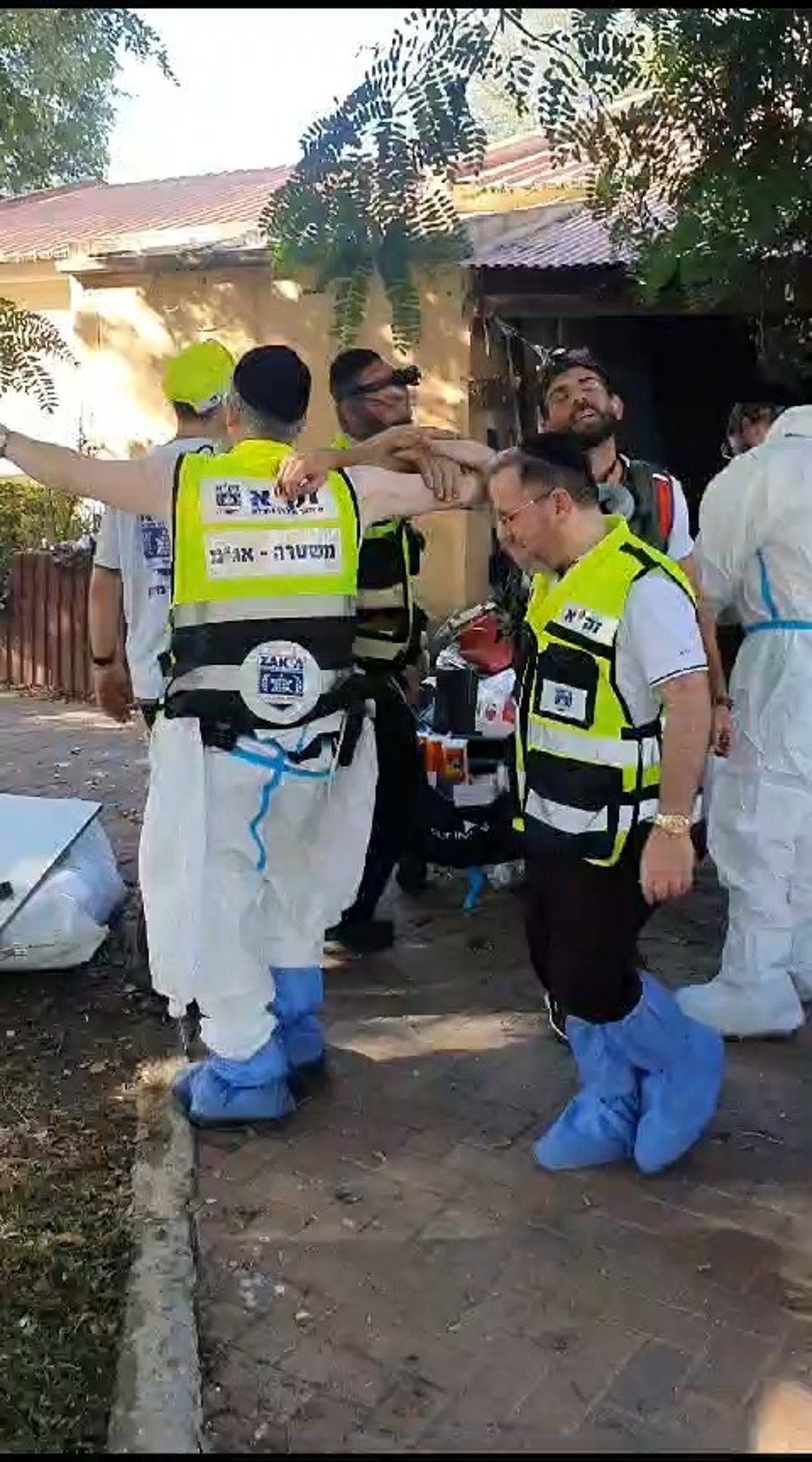 מתנדבי זק"א, הממשיכים בימים אלו לאסוף את דם הנרצחים בקיבוצים, נכנסו לאחד הבתים והחלו לטפל בממ"ד בו נטבחו ונשרפו ילדים קטנים | המתנדבים נשברו ולא היו מסוגלים להמשיך בעבודתם| הם יצאו מהבית ורקדו מספר דקות כדי לאגור כוחות בהמשך העבודה הלא אנושית • תיעוד (חרדים)