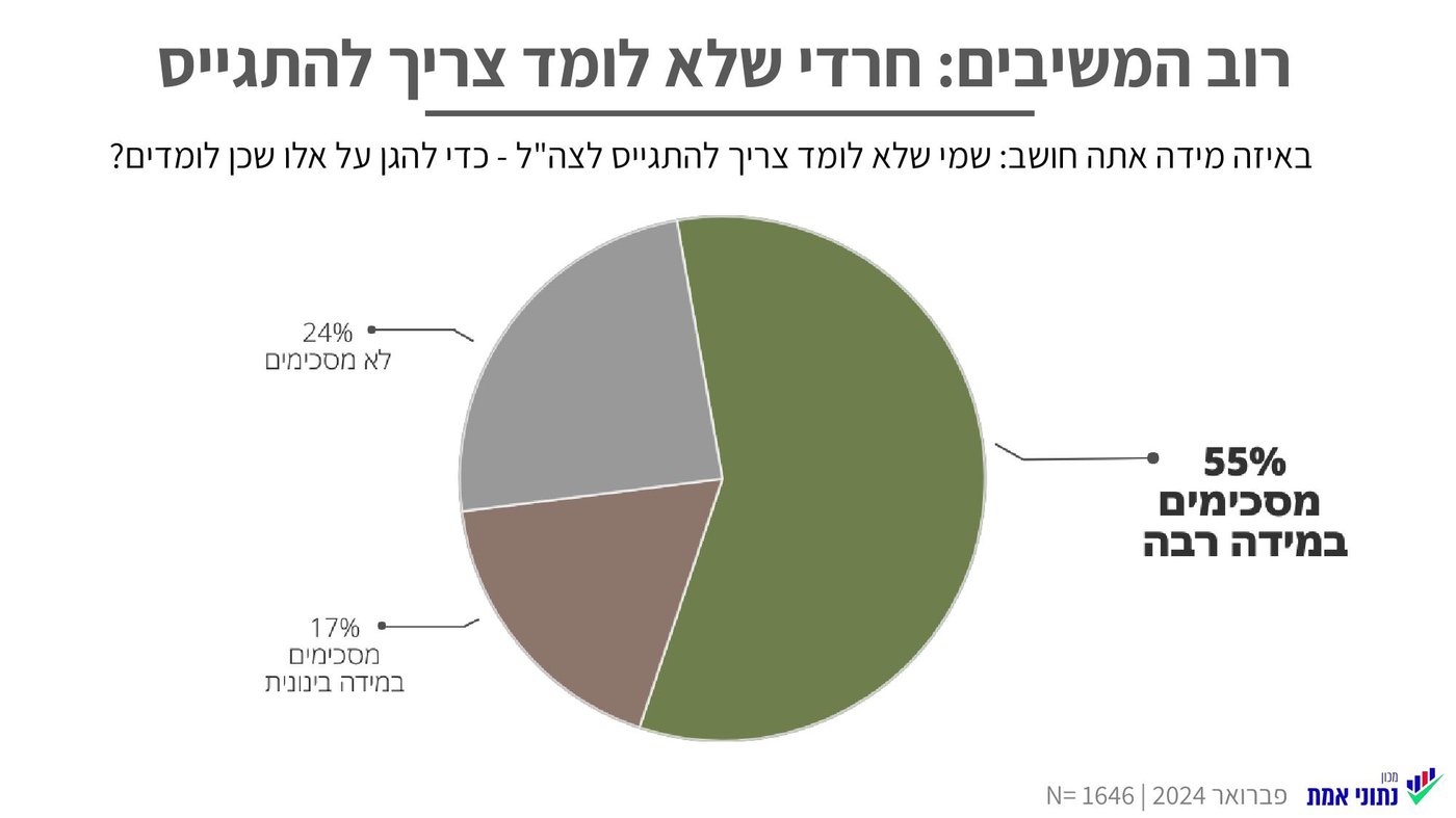 רוב המשיבים - 55% סבורים שמי שלא לומד תורה צריך להתגייס לצה"ל כדי להגן על אלו שכן לומדים. 24% לא מסכימים ומתנגדים לכל גיוס. למעשה, אין בכך חידוש שכן את האמירה הזו אנחנו שומעים שוב ושוב גם מפוליטיקאים וגם מרבנים וראשי ישיבות.