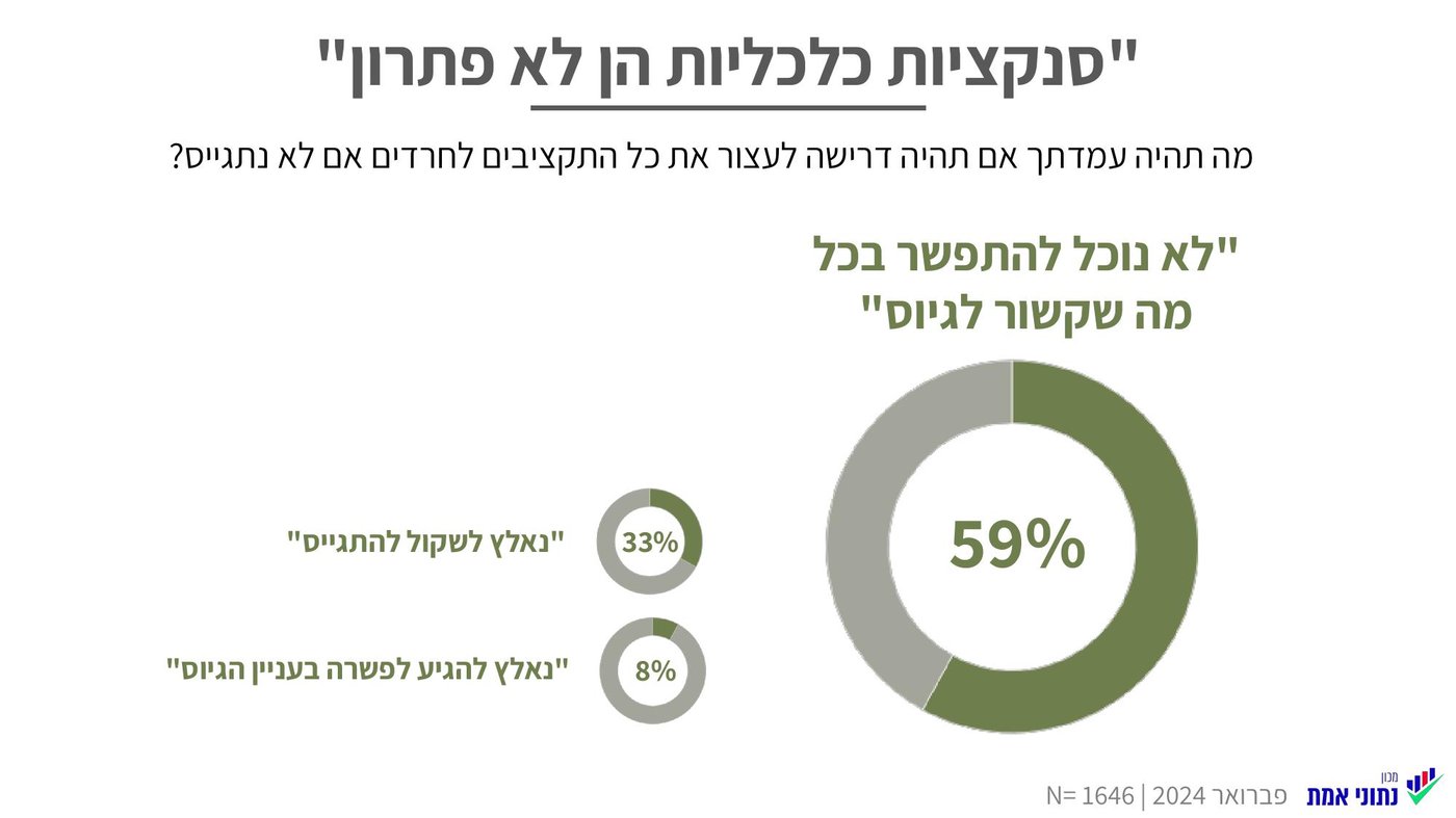 התשובה הזו מסבירה באופן די ברור גם את הנתון הבא, לפיו, 59% לא יתפשרו בכל מה שקשור לגיוס גם אם תהיה דרישה לעצור את כל התקציבים לעולם התורה החרדי. כסף הוא לא הסיפור. ואיום רוחני - מאיים יותר מכל סנקציה כלכלית.