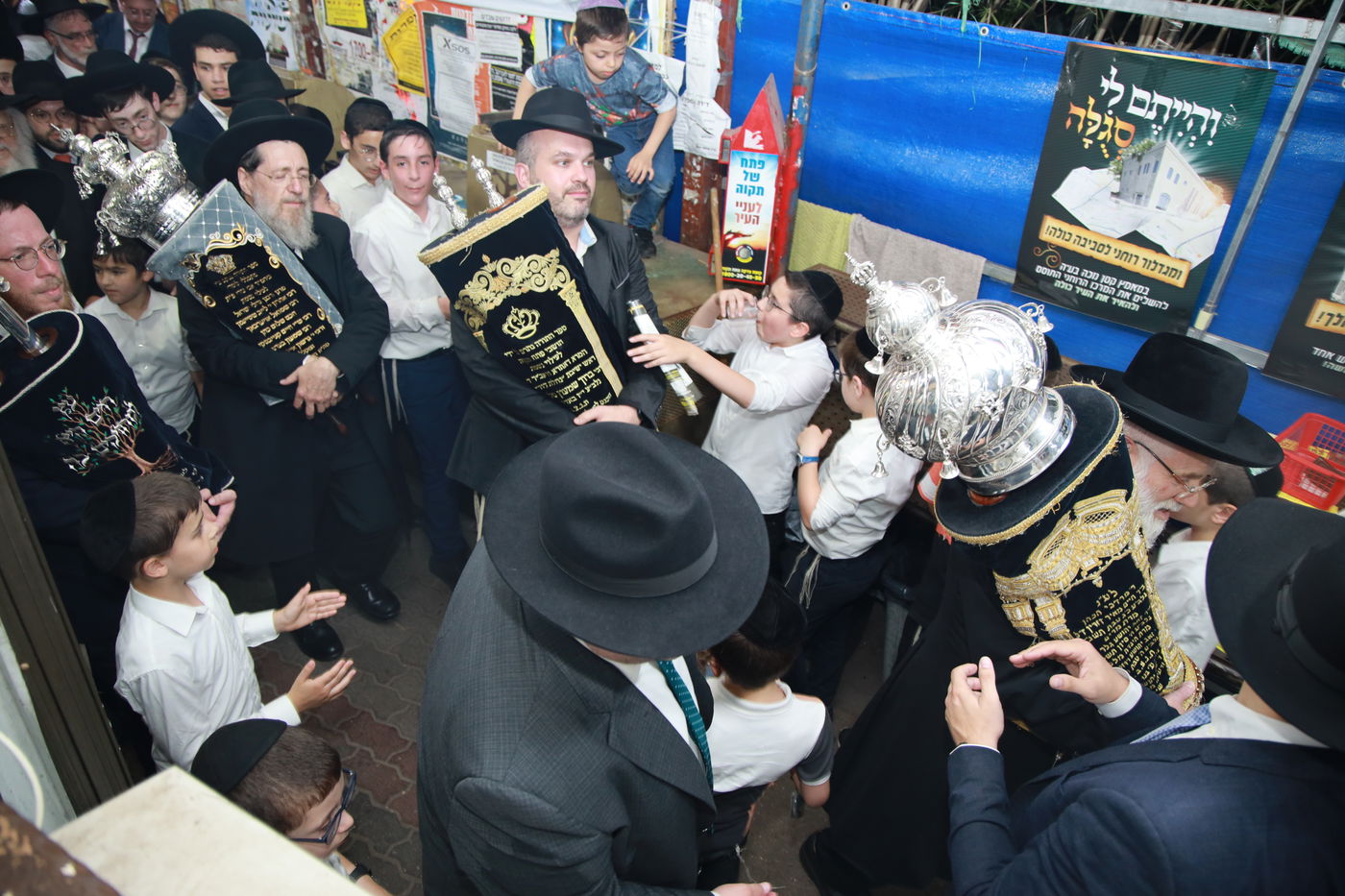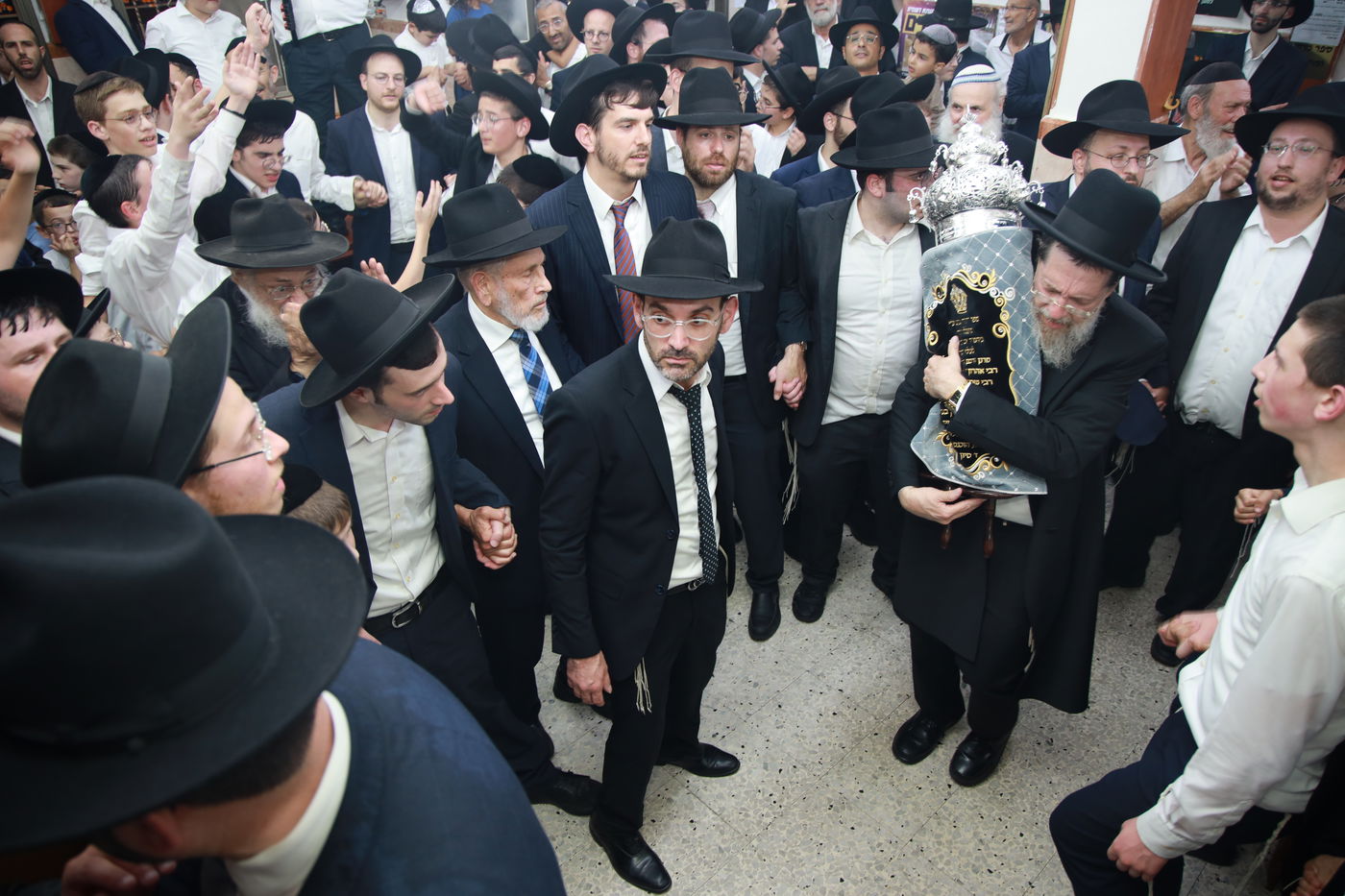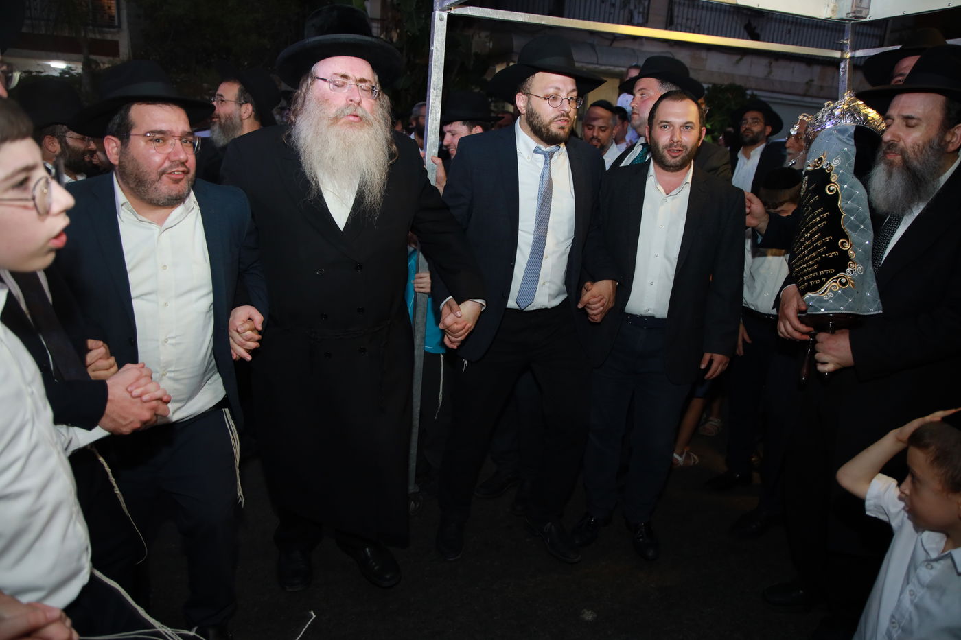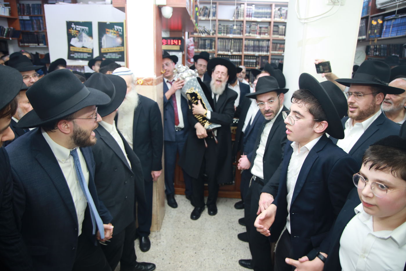 לאחר מכן יצאה התהלוכה ברוב פאר והדר, בשירים ובמחולות, בסיוע היחידה לתרבות חרדית בניהולו של הרב אברהם פקטר, ובליווי מאות מילדי העיר, בני הישיבות ותושבים נרגשים, שרקדו ופיזזו לכבודה של תורה, לכל אורך התהלוכה ברחובות העיר עד לבית המדרש, שם המשיכה שמחת התורה במשך זמן רב.