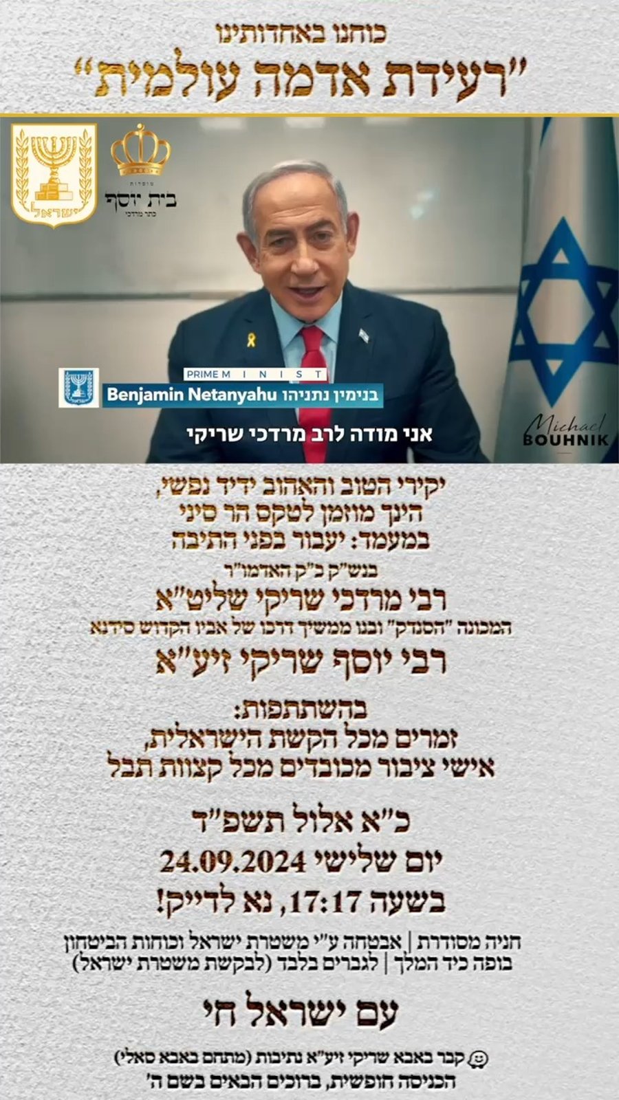 עצרת אחדות וסליחות היסטורי בעיר הקודש נתיבות האדמו"ר רבי מרדכי שריקי שליט"א המכונה "הסנדק", מזמין את הציבור הרחב לאירוע יוצא דופן שיתקיים ביום שלישי, כ"א אלול תשפ"ד (24 בספטמבר 2024 למניינם), בקבר באבא שריקי זצוק"ל (במתחם קבר באבא סאלי) בנתיבות.