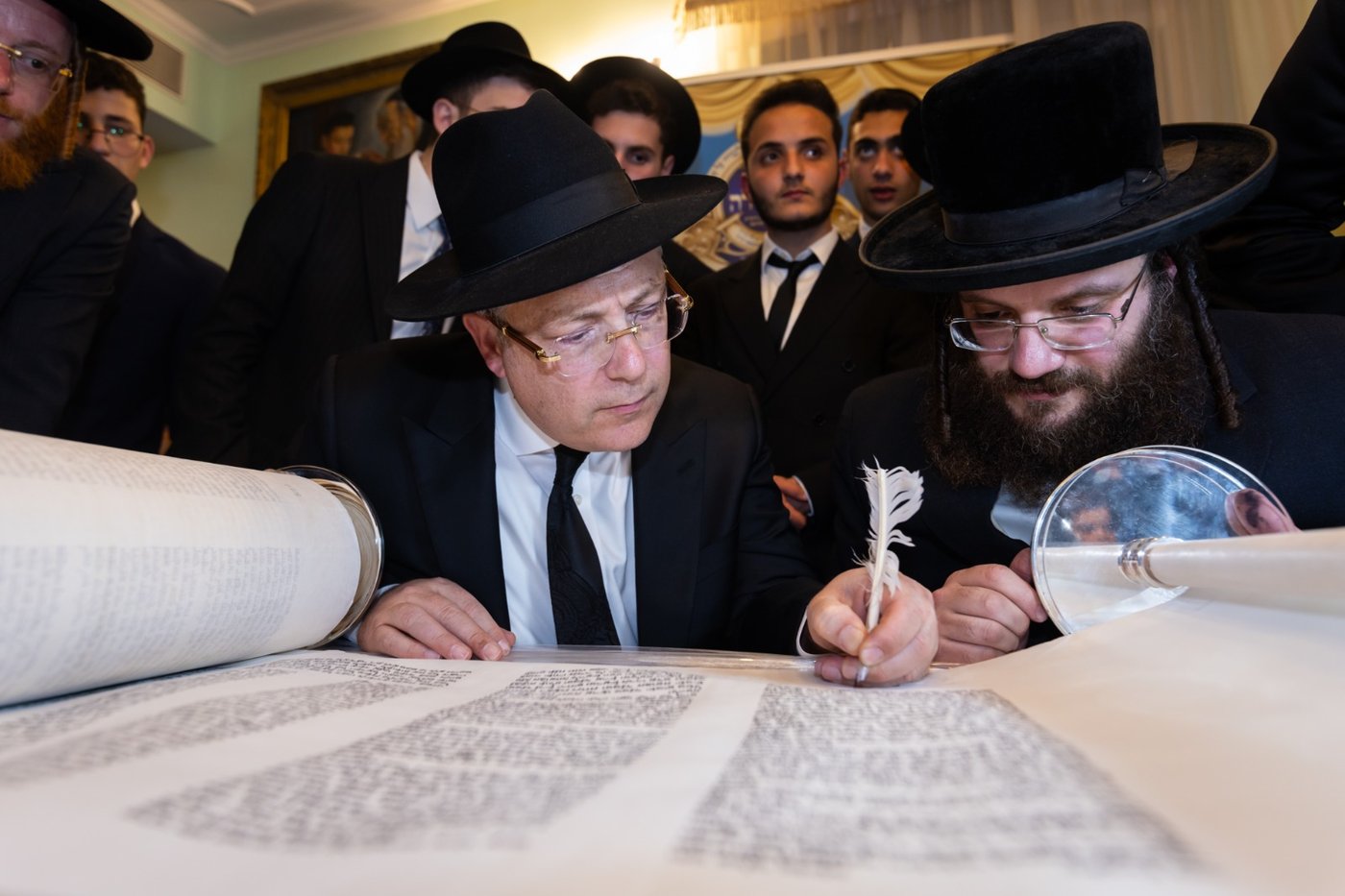 למעמד קדם רגעים מרגשים ומיוחדים, כאשר הרבנים הגאונים; רבי ברוך דוב פוברסקי, רבי יצחק זילברשטיין ורבי שאול קנייבסקי, כתבו אותיות בספר התורה החדש בביתם, לשם הגיעה הנהלת הישיבה בראשות הרה"ג רבי משולם ברנדוין.