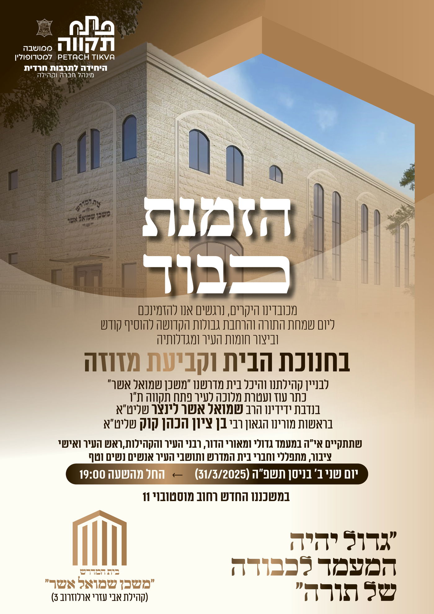פתח תקווה התורנית לובשת חג לקראת יום שמחת התורה והרחבת גבולות הקדושה במעמד ההיסטורי של חנוכת בית המדרש החדש של קהילת "אבי עזרי" – ביהמ"ד "משכן שמואל אשר", וקביעת המזוזות במשכנו החדש והמפואר, ברחוב מוסטבוי במרכז העיר.