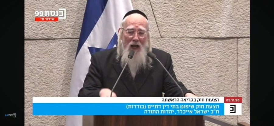 במהלך דיון הערב (שני) במליאת הכנסת שעסק בחוק הדיינים - חוק בו תצביע הקואליציה יחד עם החרדים, לאחר שנסגר דיל עם הליכוד - למרות החרם, חבר הכנסת ישראל אייכלר עלה לנאום ותקף בחריפות את הממשלה.