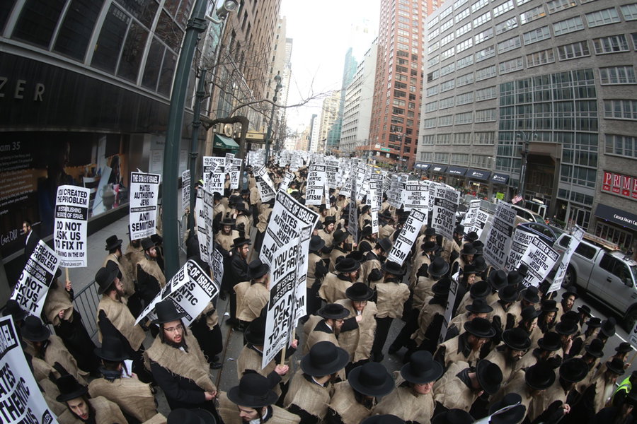 האברכים עמדו לאורך כל הרחוב כשהם לבושים בשק ואפר, ושלטים וכרוזים מחאה מונפים בידיהם ובהם סיסמאות וסלוגנים בשפה האנגלית במטרה להסביר לאומות העולם את הגזירה.
