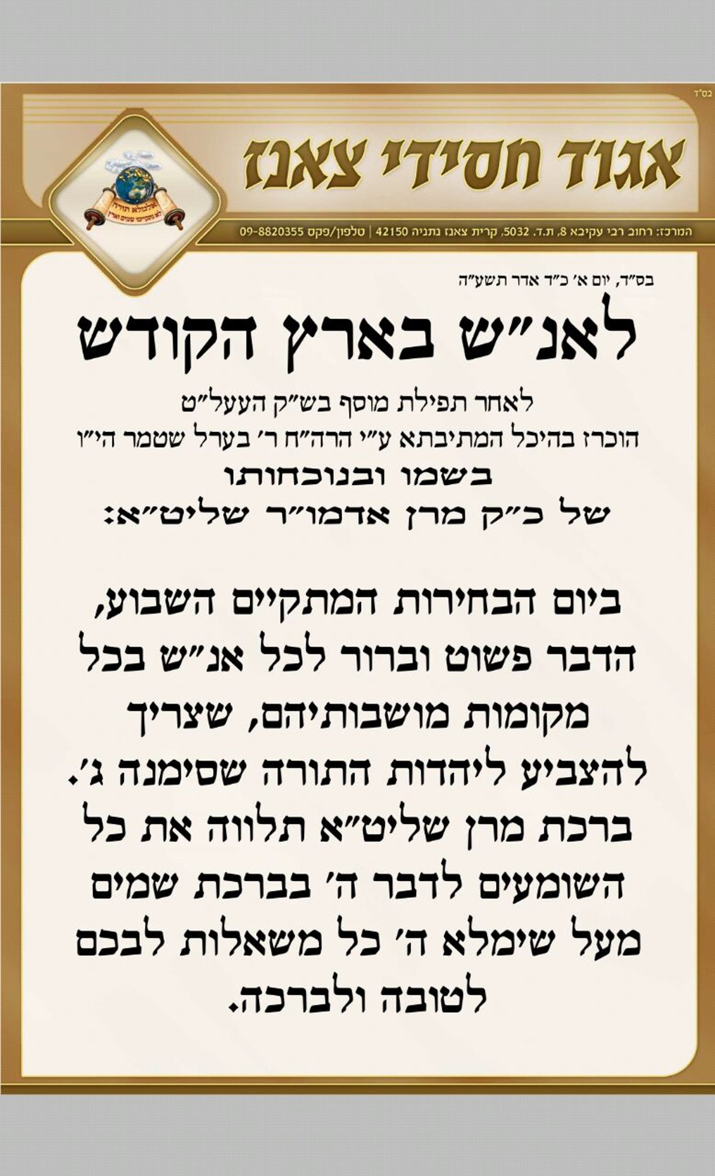 תחת הכותרת: "לאנ"ש בארץ הקודש", נכתב כי "לאחר תפילת מוסף בשבת קודש הוכרז בהיכל המתיבתא ע"י הרה"ח ר' בערל שטמר הי"ו בשמו ובנוכחותו של כ"ק מרן אדמו"ר שליט"א: 'ביום הבחירות המתקיים השבוע, הדבר פשוט וברור לכל אנ"ש בכל מקומות מושבותיהם, שצריך להצביע ליהדות התורה שסימנה ג''".