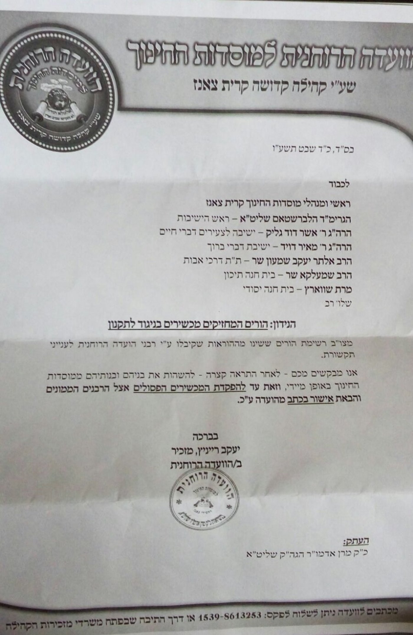 תחת הכותרת: "הנידון: הורים המחזיקים מכשירים בניגוד לתקנון", כותב מזכיר הוועדה הרוחנית יעקב רייניץ, "מצורף בזה רשימת הורים ששינו מההוראות שקיבלו על ידי רבני הוועדה הרוחנית לעניני תקשורת".