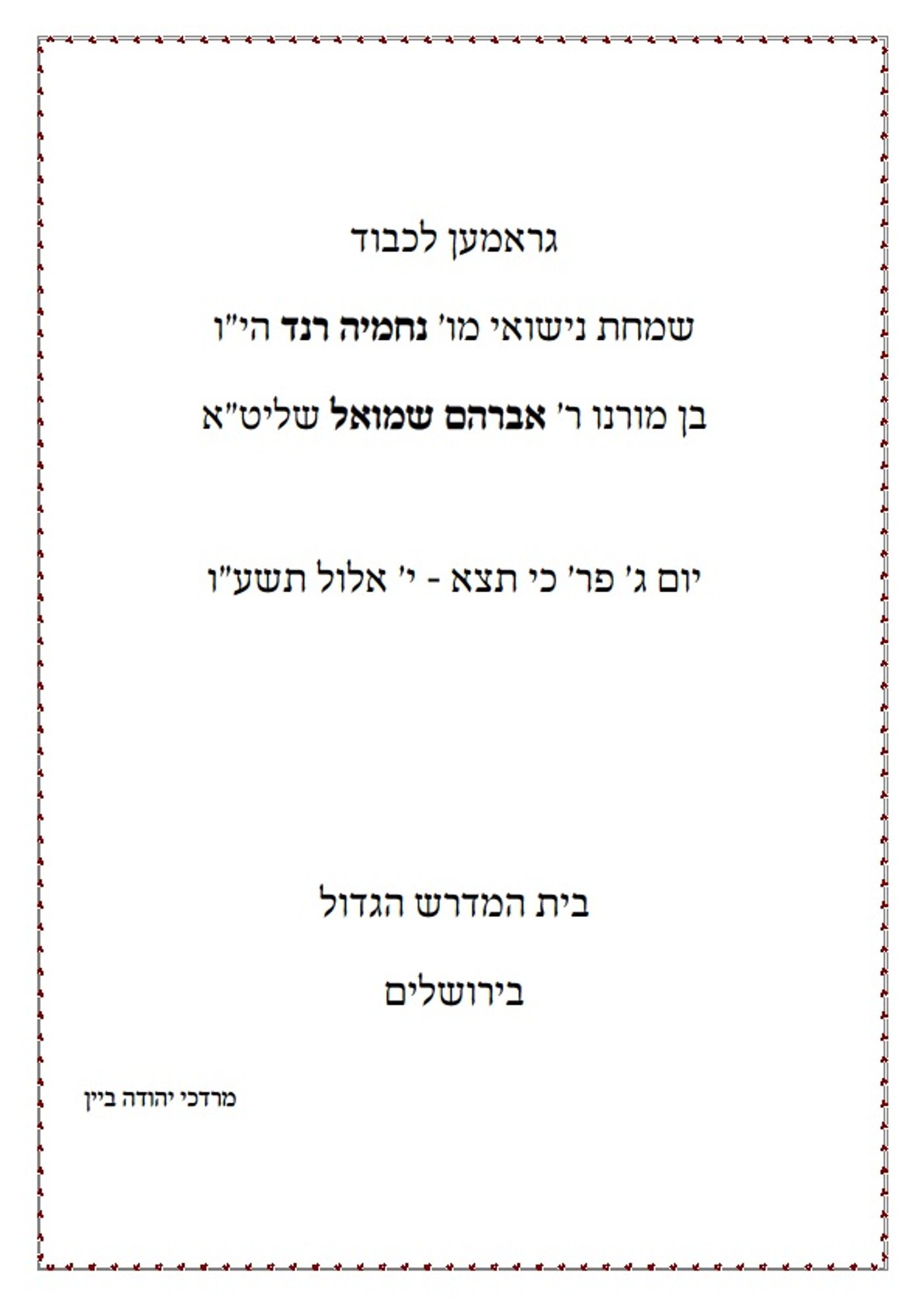 רבבות חסידים יגיעו החל משעות הצהריים (שלישי) מכל רחבי הארץ למרכז החסידות בירושלים לרגל שמחת נשואי נכד כ"ק מרן האדמו"ר מגור, החתן נחמיה ראנד, בן לחתנו הרב אברהם שמואל ראנד, בנו של הנגיד הרב שלום אלימלך ראנד ונכדו של הנגיד הרבני, הרב יהושע הלר עם הכלה בת למשפחת וינברג מבני ברק.