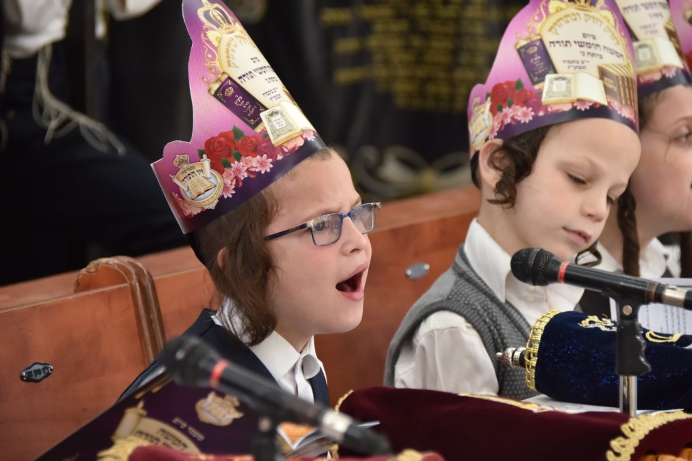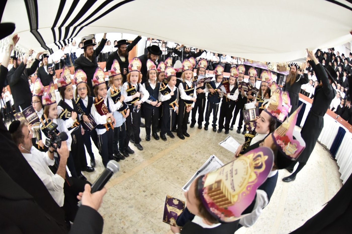 בהוד קדומים נתעטרו בכתרה של תורה ילדי כיתה ג' דת"ת 'זיו התורה' בבני ברק במעמד מרטיט, מפואר ומרומם - מעמד סיום חמישה חומשי תורה כאשר במעמד משתתפים הורי וסבי התלמידים היקרים וביניהם אדמורי"ם ורבנים • הצלם יהושע פרוכטר תיעד (חסידים)