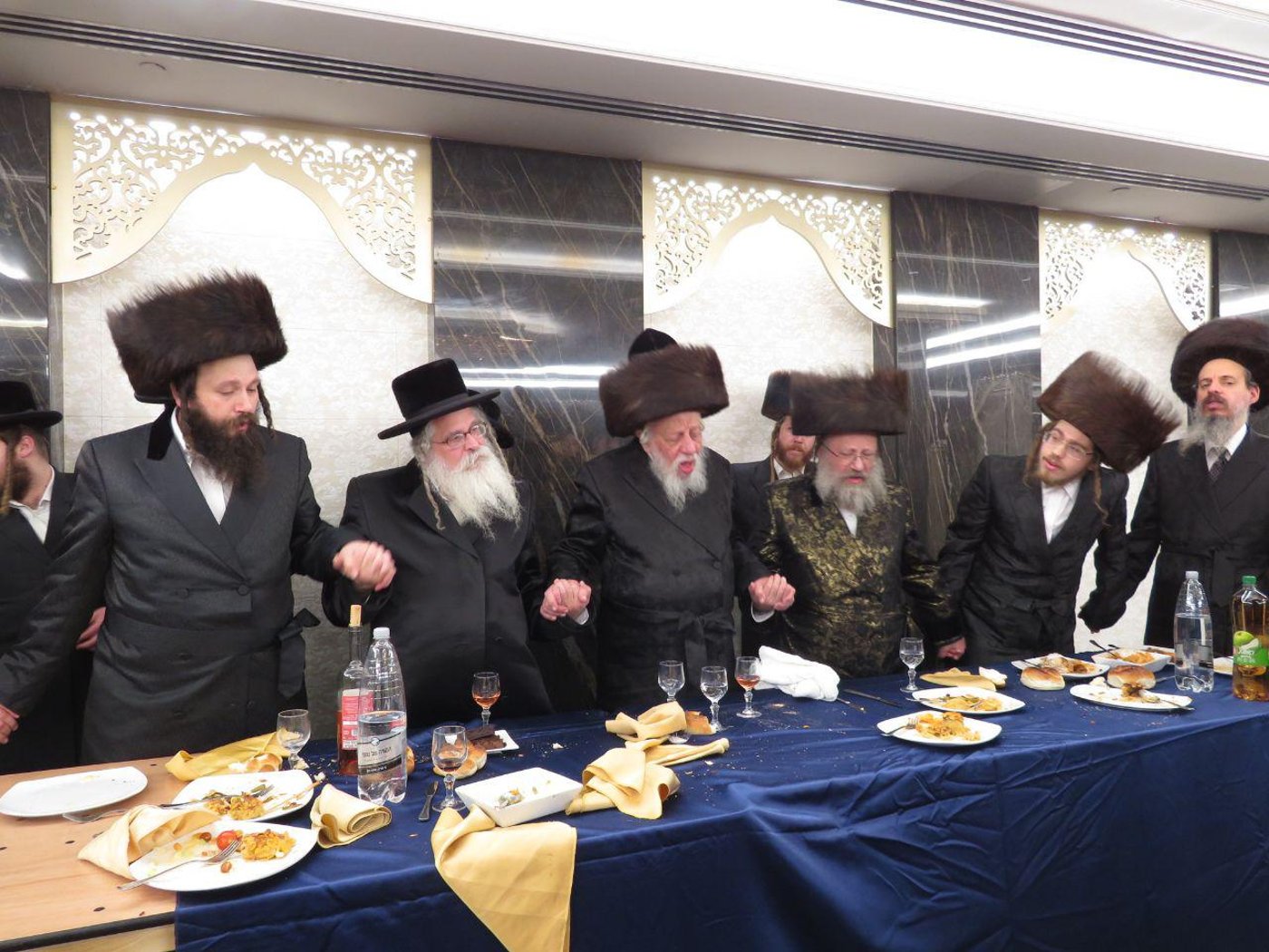 החוגגים סעדו את ליבם בסעודה חגיגית, ולאחר ברכת המזון פצחו האדמו"רים בריקוד של שמחה.