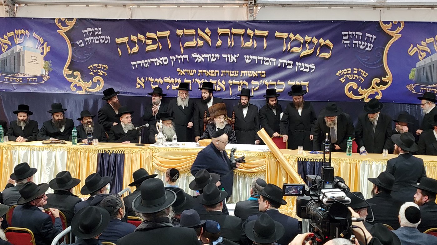 אמש (ראשון) חגגו באוהל ענק מעמד הנחת אבן הפינה לבית מדרש חדש של החסידות שיוקם במקום.