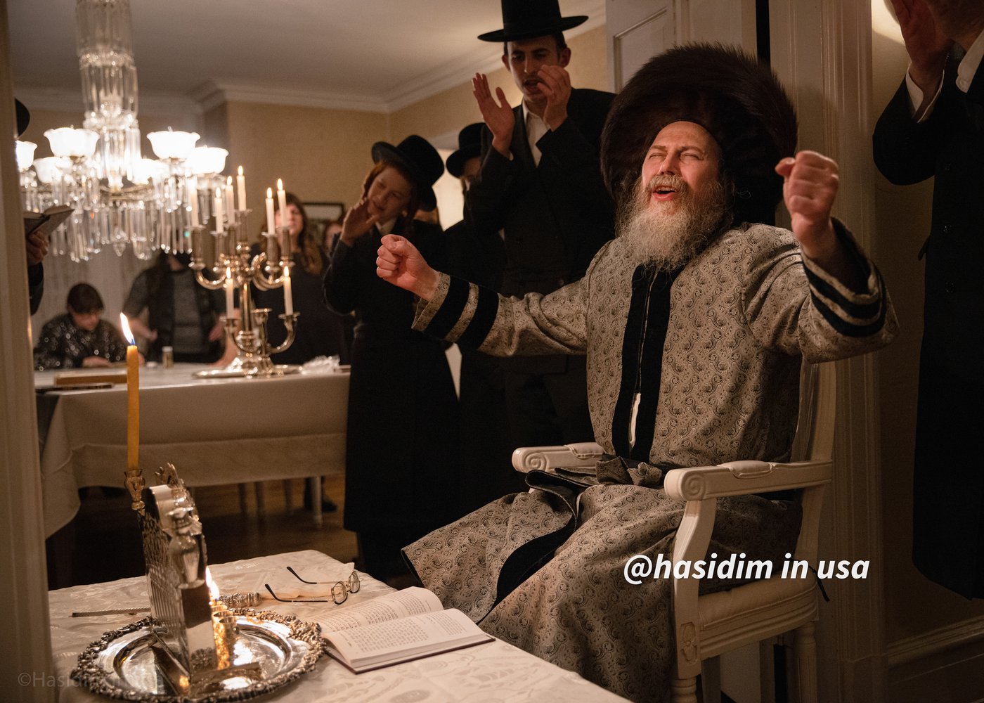 האדמו"ר ממושולו, הגיע להדלקת נרות בבית אחד מחסידיו בניו יורק, שם תיעד אותו הצלם המסתורי המכונה אבי קיי בעת הניגון בכינור, ובריקוד הסוער אחרי הדלקת החנוכיה (חסידים)