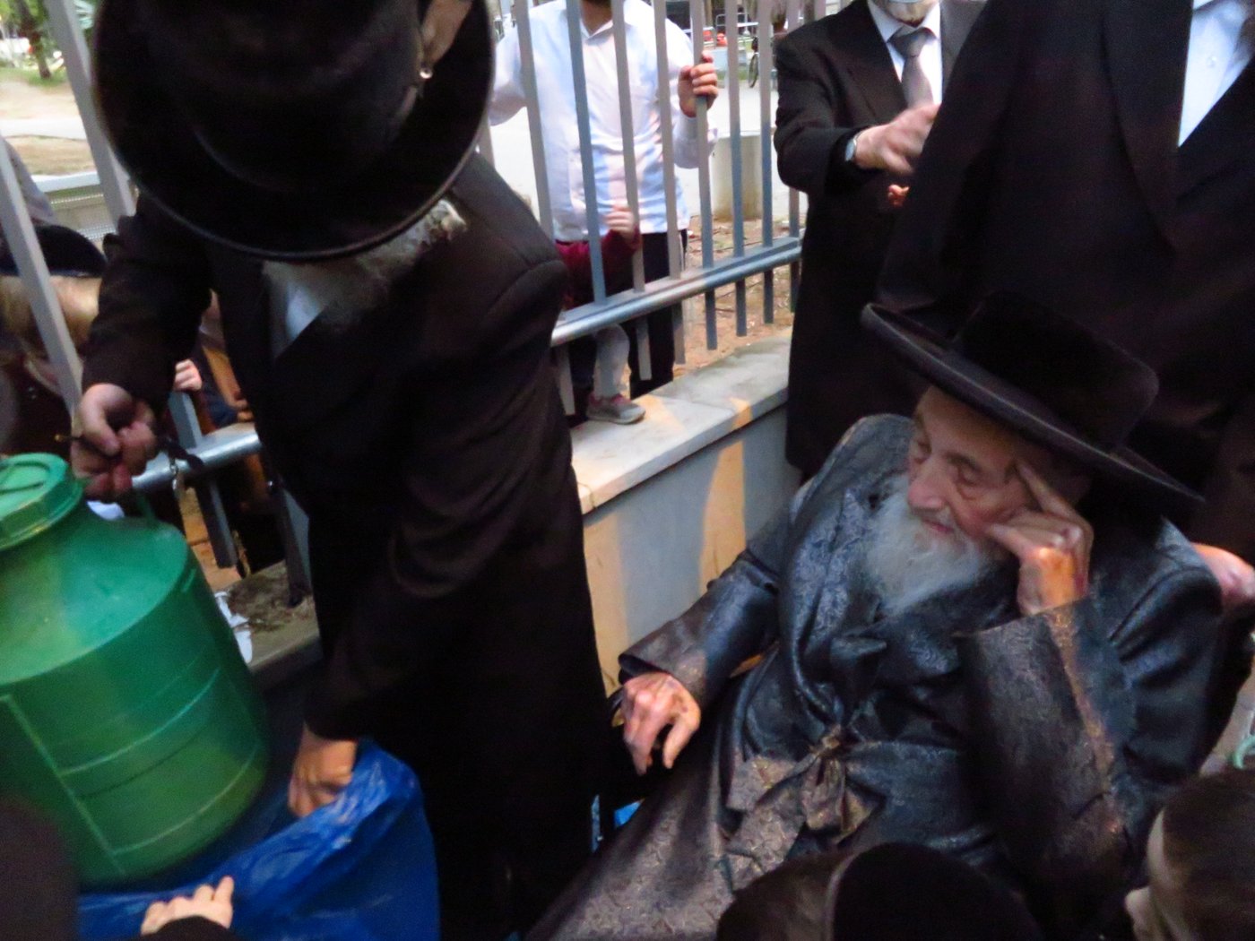 החסידים שאבו את המים עבור הרבי ששפך את התכולה לתוך מכולות מיוחדות לקול שירתם של החסידים ששרו מניגוני חג הפסח.