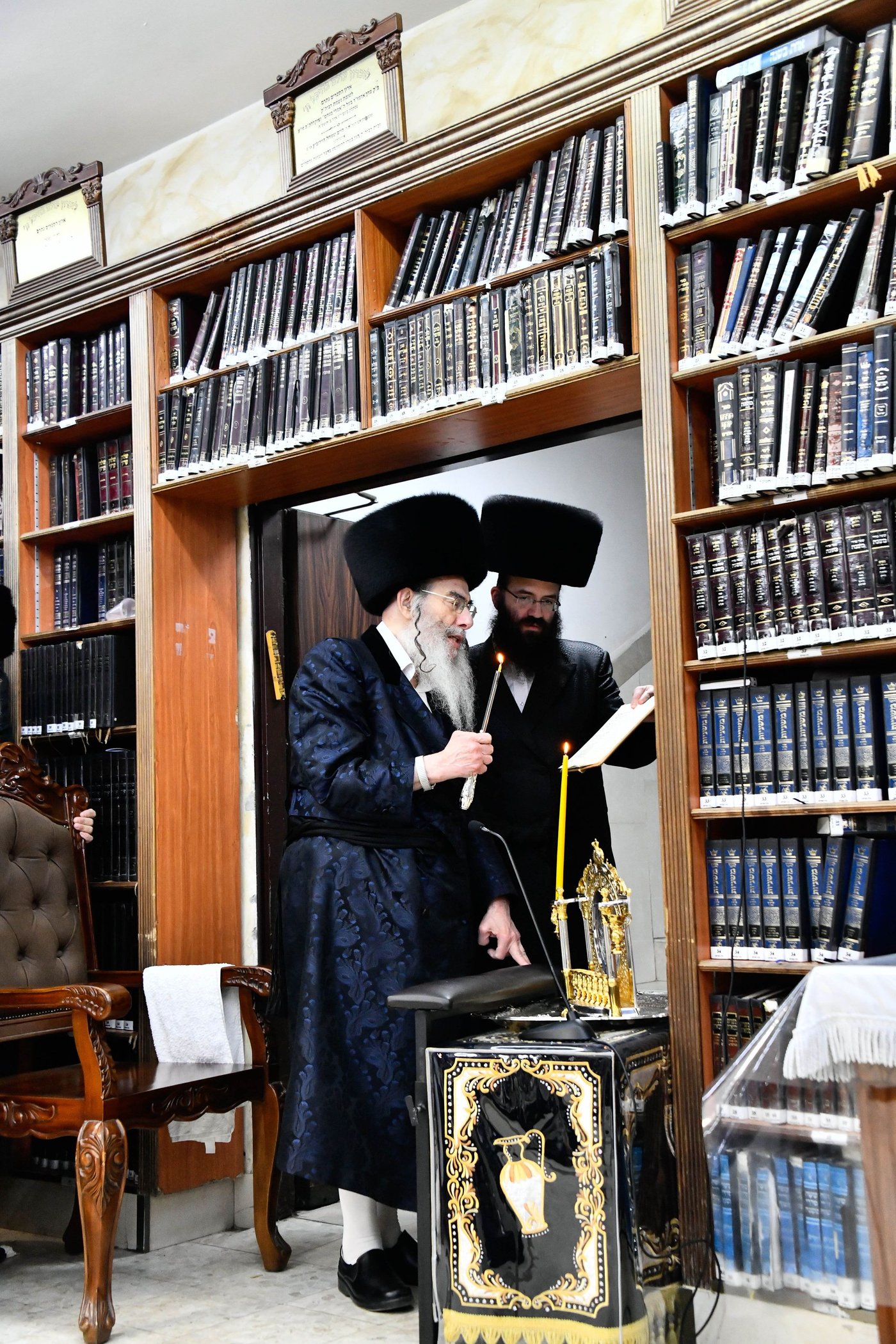 בהיכל בית מדרשו הישן ברחוב דבורה הנביאה בבני ברק, העלה אמש האדמו"ר מקומרנא את נרות החנוכה. הרבי היה חבוש בקאלפיק מירושת אביו זצ"ל, והדליק בחנוכייה עתיקה מירושת אדמו"רי החסידות | בסיום המעמד ערך הרבי טיש לחיים וחילק מטבעות קודש לברכה (חסידים)