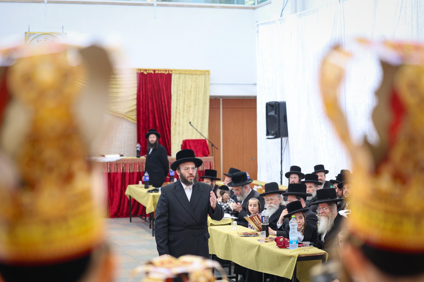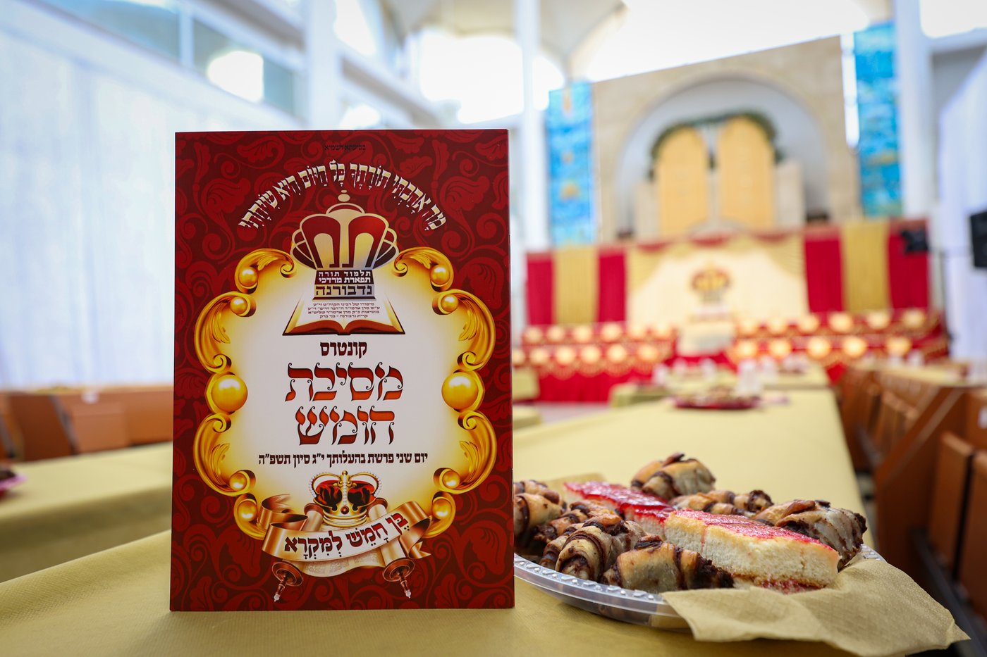 בהיכל הטישים בחצה"ק נדבורנה, נחוגה ברוב פאר והדר מעמד ה'חומש סעודה' לילדי החמד, צאן הקדשים מתלמוד התורה 'תפארת מרדכי' - נדבורנה | את המעמד פיאר בהופעתו הכבודה האדמו"ר מנדבורנה, אשר אחד מנכדיו ג"כ היה מחתני התורה | במעמד השתתפו לצד ההורים והסבים הנרגשים, הגאון רבי יצחק ישעיהו וייס, גאב"ד נווה אחיעזר, והאדמו"ר מזידטשוב מחותנו של האדמו"ר מנדבורנה | במעמד ישבו ילדי החמד במזרח בית המדרש, והרבי ישב ממולם בצד מערב (חסידים)