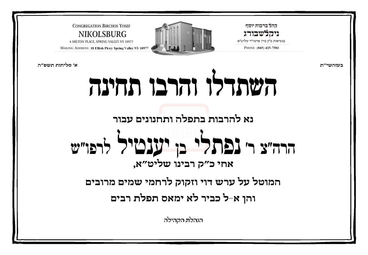 מאות תושבי ווילאסמבורג נהרו השבת לחסות בצילו של האדמו"ר מניקלשבורג אשר הגיע לשבות בשכונה לראשונה מזה למעלה מעשרים שנה | הרבי המתגורר במונסי, עשה פעמיו על פמליה מכובדת מחסידיו לשבות בעיר, שם הרעיף טללי חיזוק ותחיה לתושבים | באשמורת בוקר יום ראשון ירד הרבי לפני התיבה לאמירת הסליחות בהתעוררות עצומה | בתוך כך, נמשכות התפילות לרפואתו השלמה והמהירה של אחיו של האדמו"ר, הרה"צ רבי נפתלי בן יענטיל בתוך שאר חולי ישראל (חסידים)