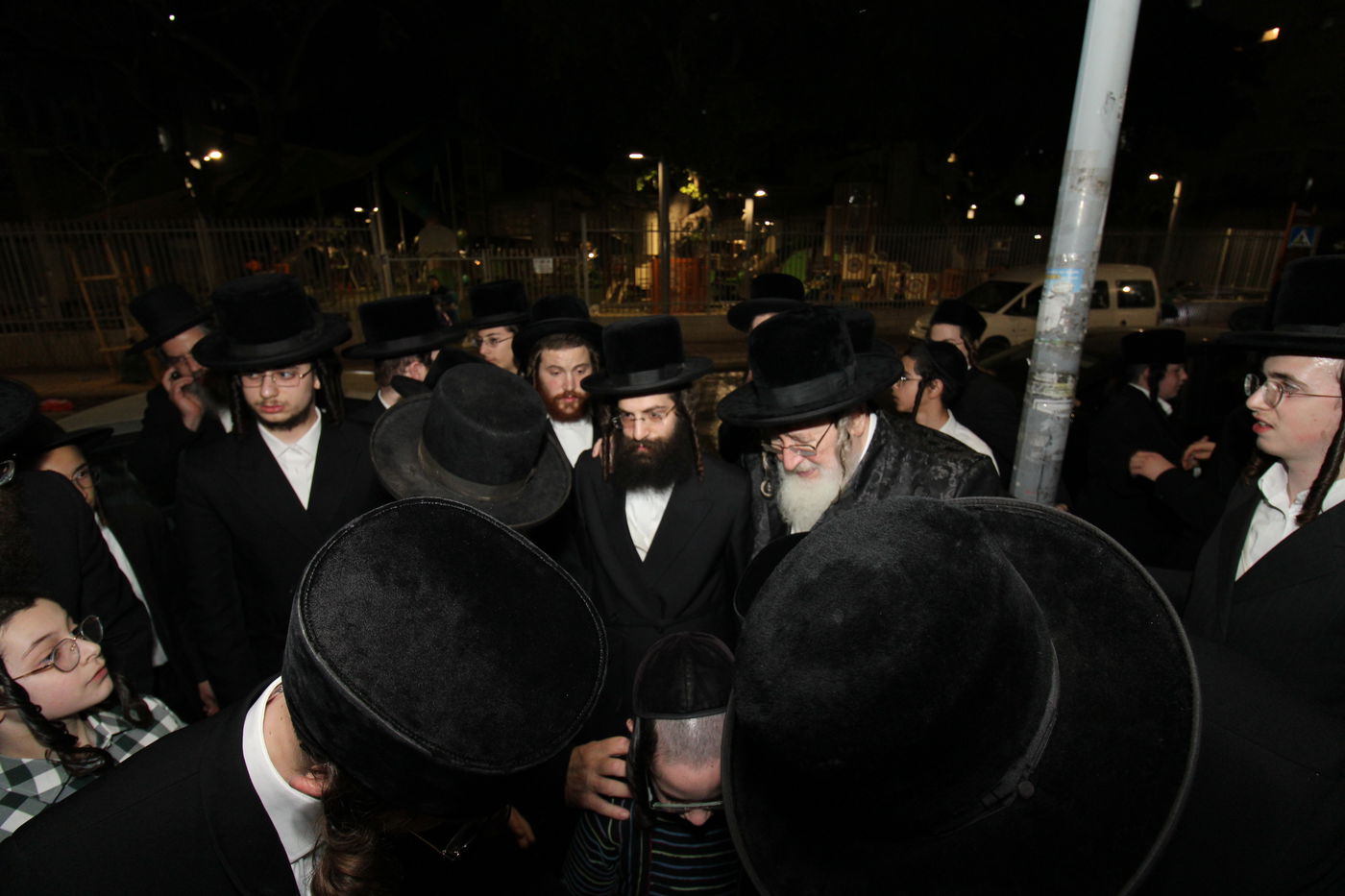 שמחת התנאים לנכד האדמו"ר ממשקולץ בן לחתנו הרב יחיאל זוננבאנד בן הרה"צ דב זוננבאנד חתן האדמו"ר ה'אמרי מנחם' מאלכסנדר זצ"ל, עם הכלה, נכדת האדמו"ר מקוזמיר בת לחתנו הרב אליעזר זוסיא גרינוולד, בן הרה"ג ר' אברהם גרינוולד | במהלך השמחה פיזזו האדמו"רים עם החתן ואף נשאו דברי תורה ברום מעלת שמחת חתן וכלה (חסידים)