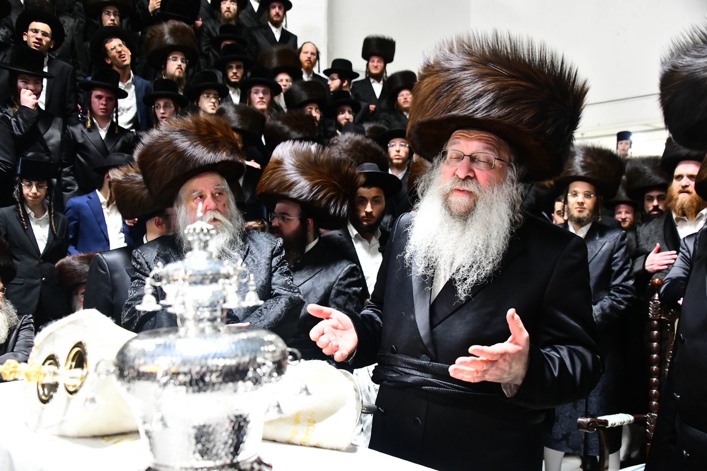 בהיכל בית מדרשו הישן ברחוב דבורה הנביאה בבני ברק, העלה אמש האדמו"ר מקומרנא את נרות החנוכה. הרבי היה חבוש בקאלפיק מירושת אביו זצ"ל, והדליק בחנוכייה עתיקה מירושת אדמו"רי החסידות | בסיום המעמד ערך הרבי טיש לחיים וחילק מטבעות קודש לברכה (חסידים)