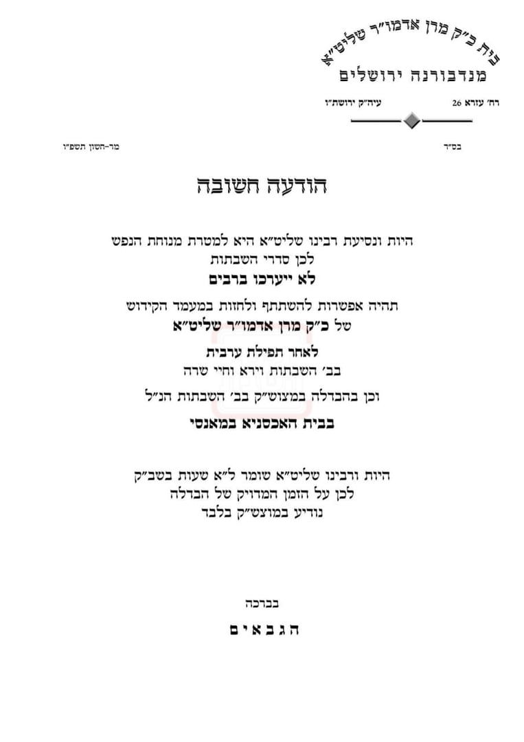 האדמו"ר מנדבורנה ירושלים יצא בימים אלו למנוחה בעיר מונסי שבניו יורק, למשך שבועיים. בהודעה מיוחדת שפרסמו גבאי החצר לחסידים בארה"ב, נמסר כי האדמו"ר הגיע לצורך מנוחה והבראה. משום כך, סדרי השבת והתפילות לא יתקיימו ברבים, מלבד מעמד הקידוש בליל שבת, וכן ההבדלה במוצאי שבת על ידי האדמו"ר, כמנהגו לאחר ל"א שעות | צפו בתיעוד (חסידים)