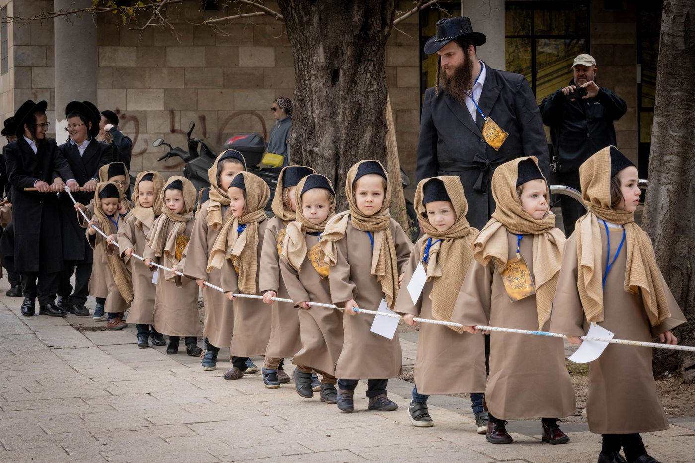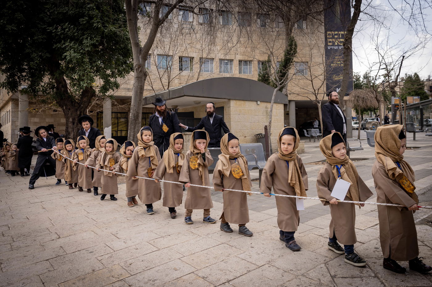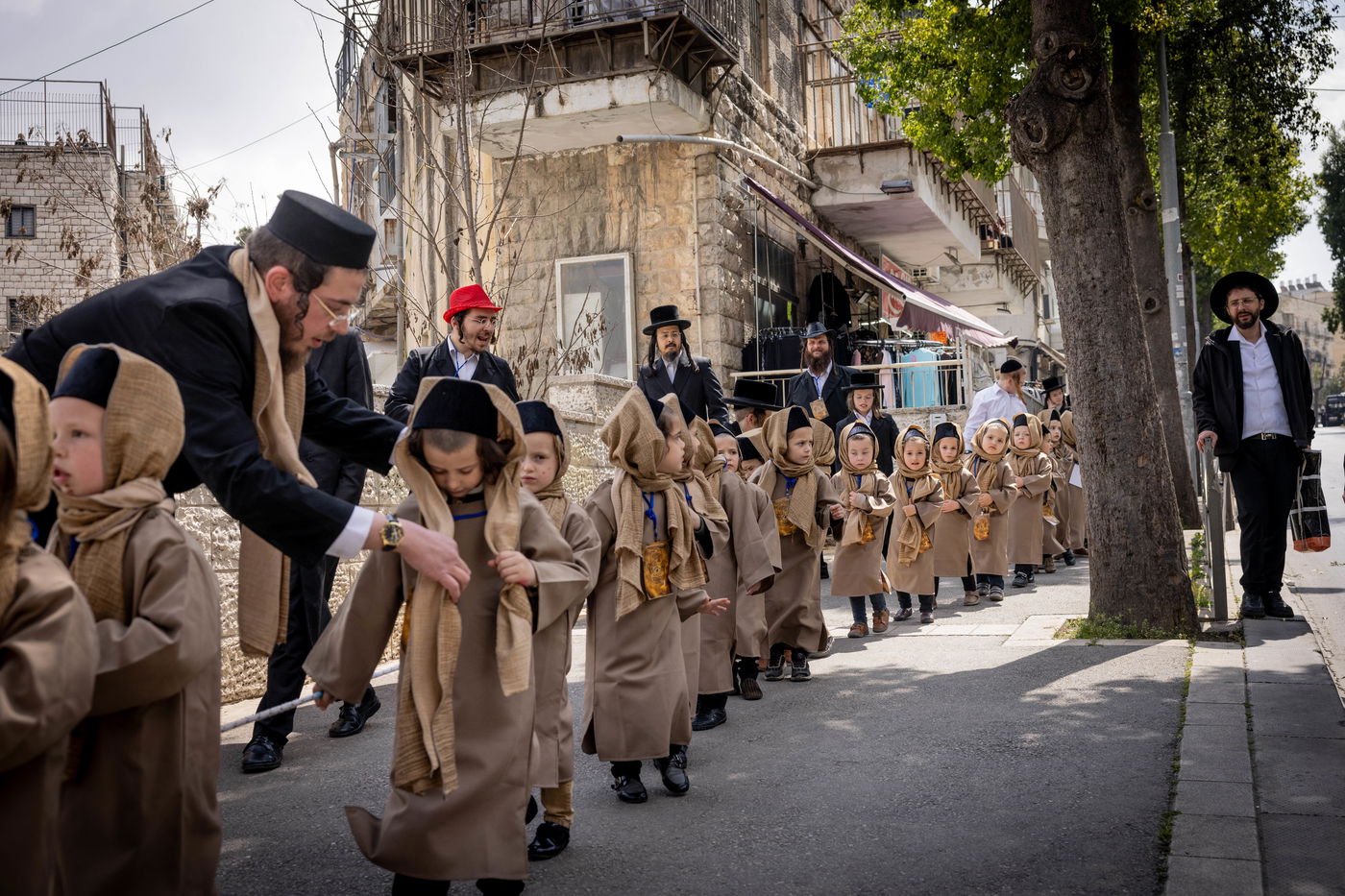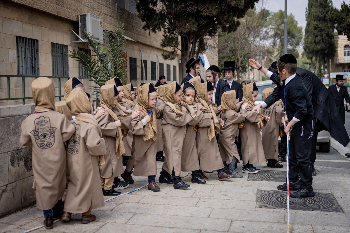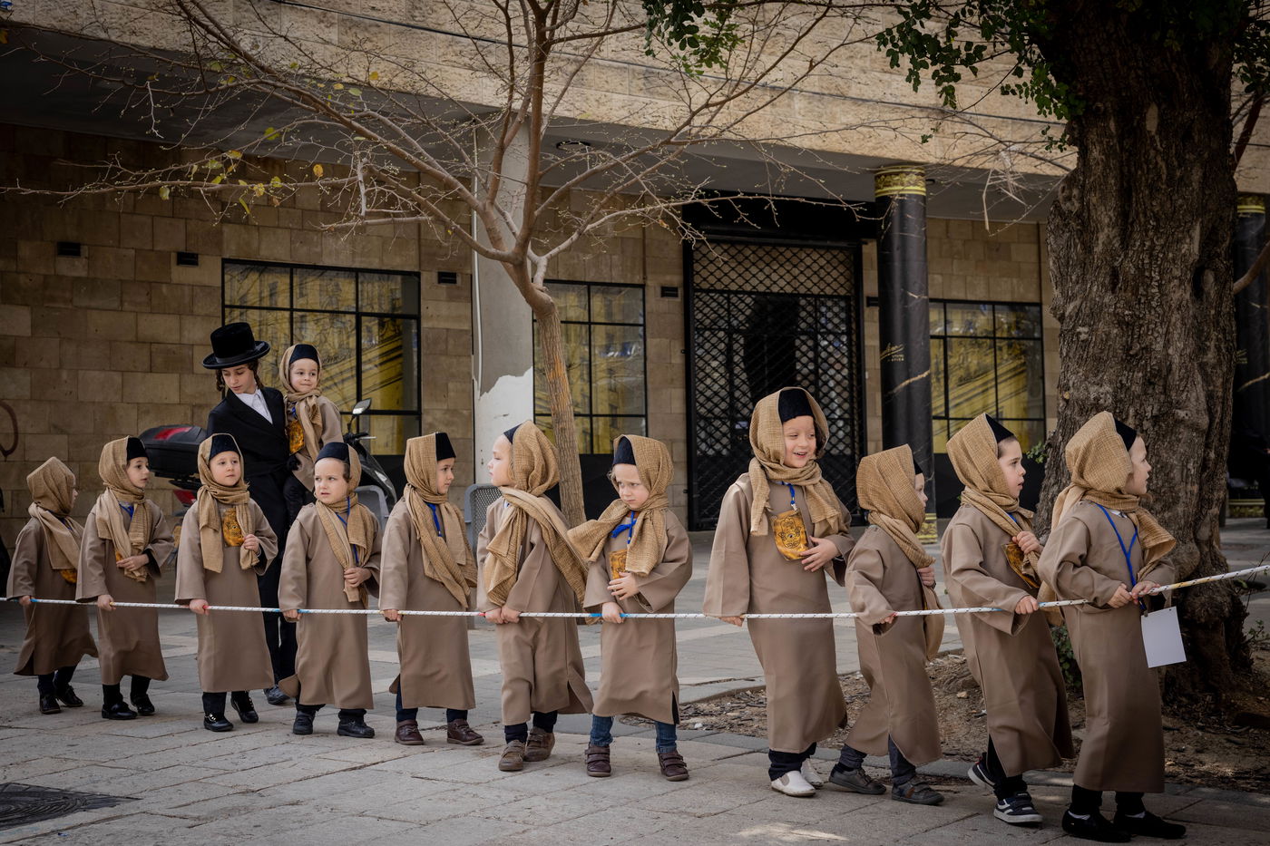 עם חן יהודי נסוך על פניהם, צעדו ילדי תלמוד תורה באיאן באזור כיכר השבת בירושלים, לבושים בתחפושת ייחודית ומקורית, המלבוש המיוחדת למקובלים מדורי דורות.