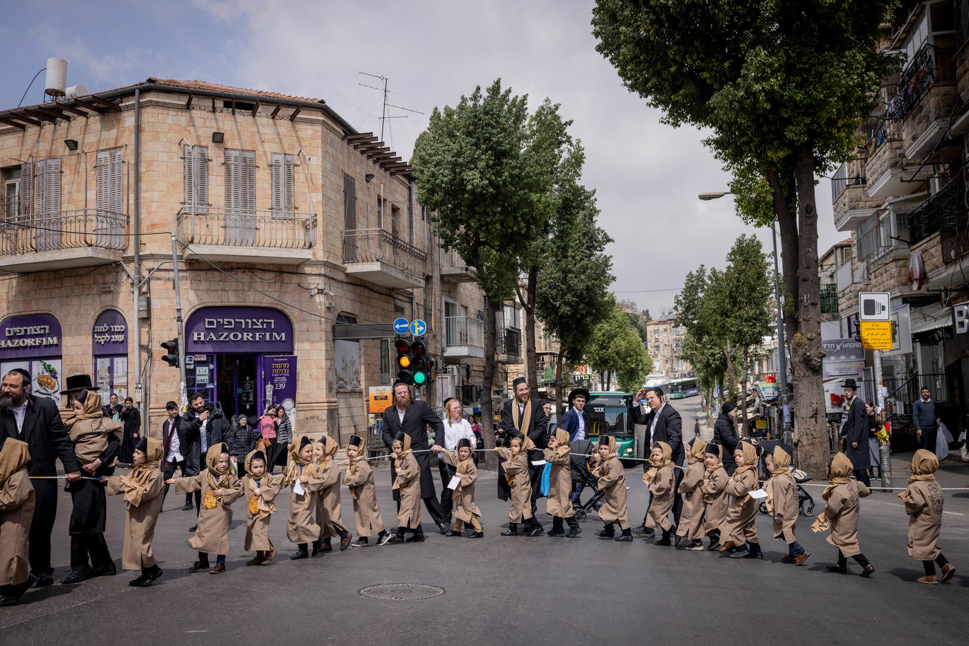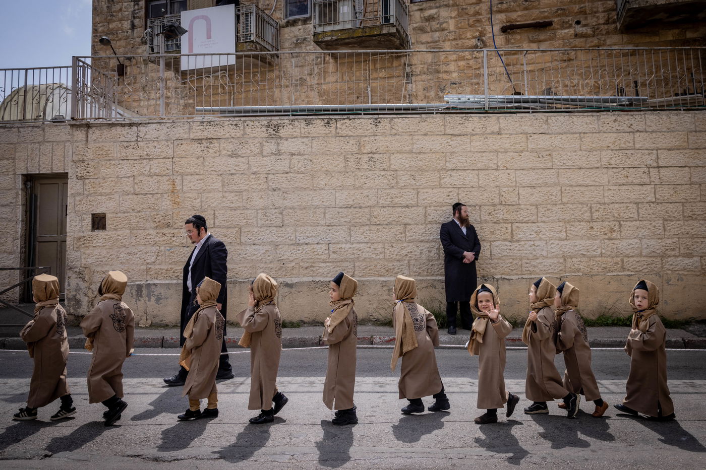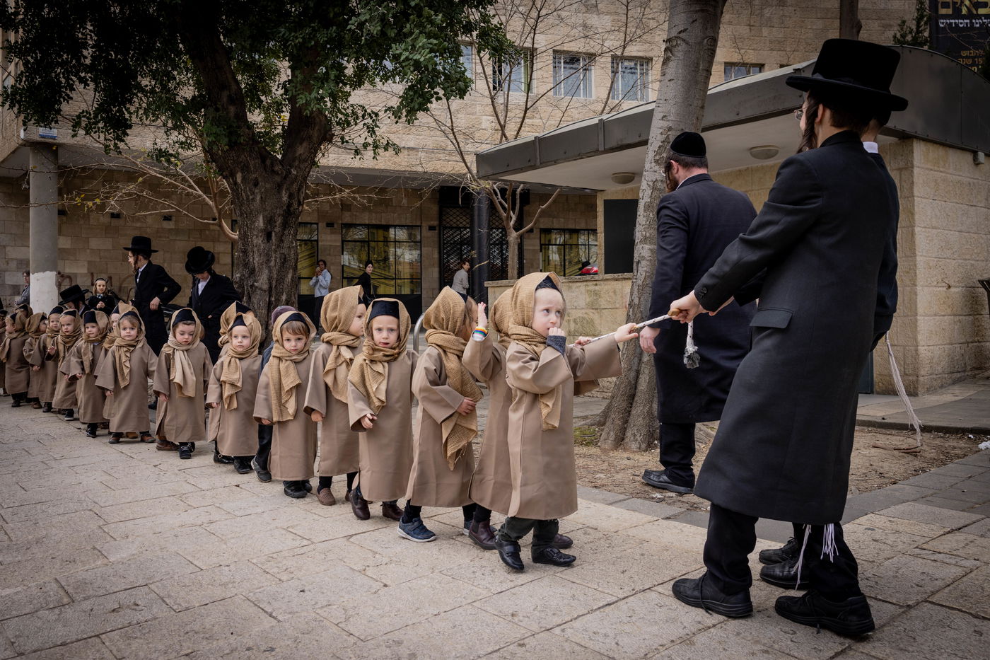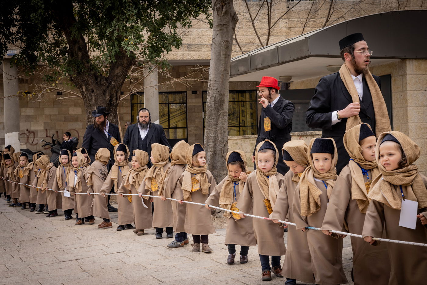 עם חן יהודי נסוך על פניהם, צעדו ילדי תלמוד תורה באיאן באזור כיכר השבת בירושלים, לבושים בתחפושת ייחודית ומקורית, המלבוש המיוחדת למקובלים מדורי דורות.