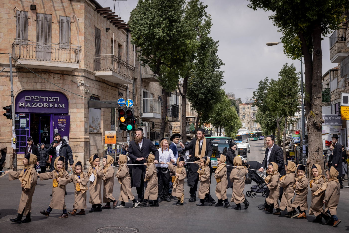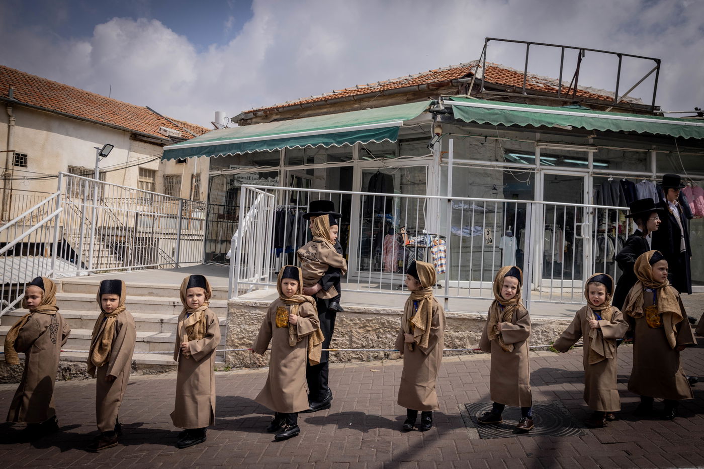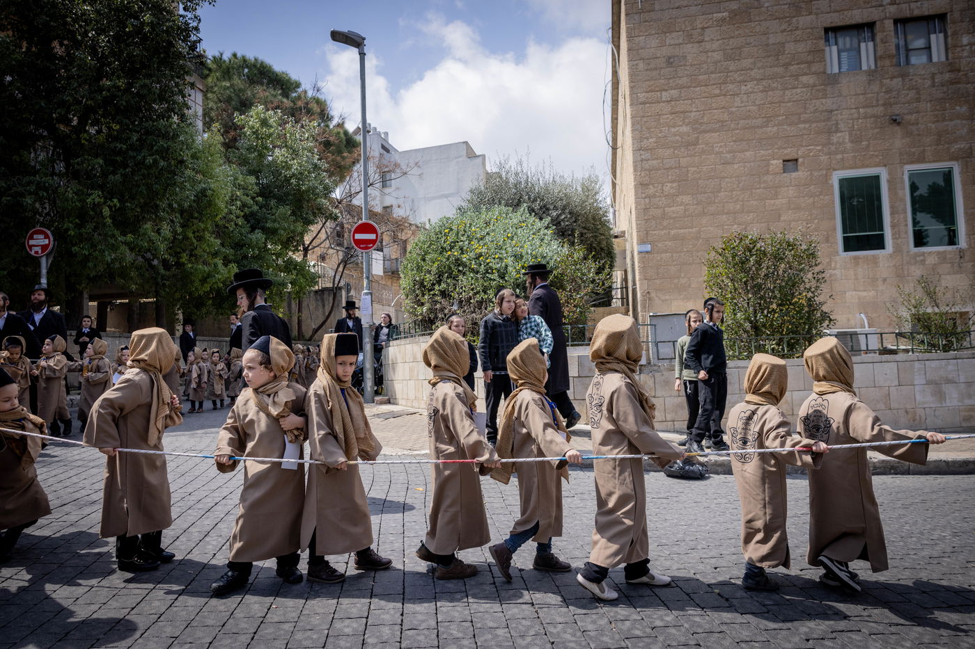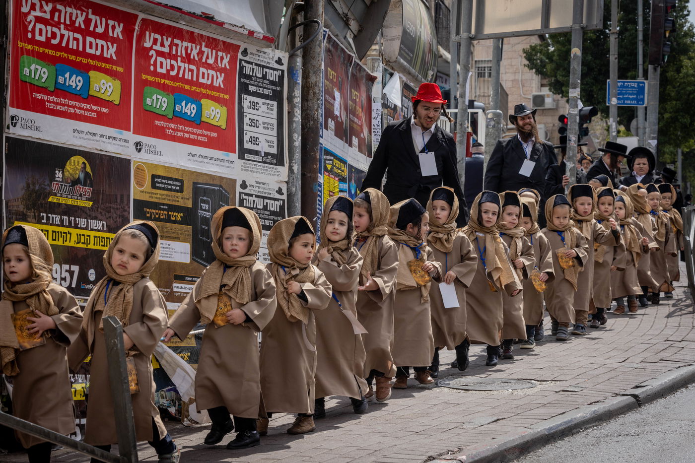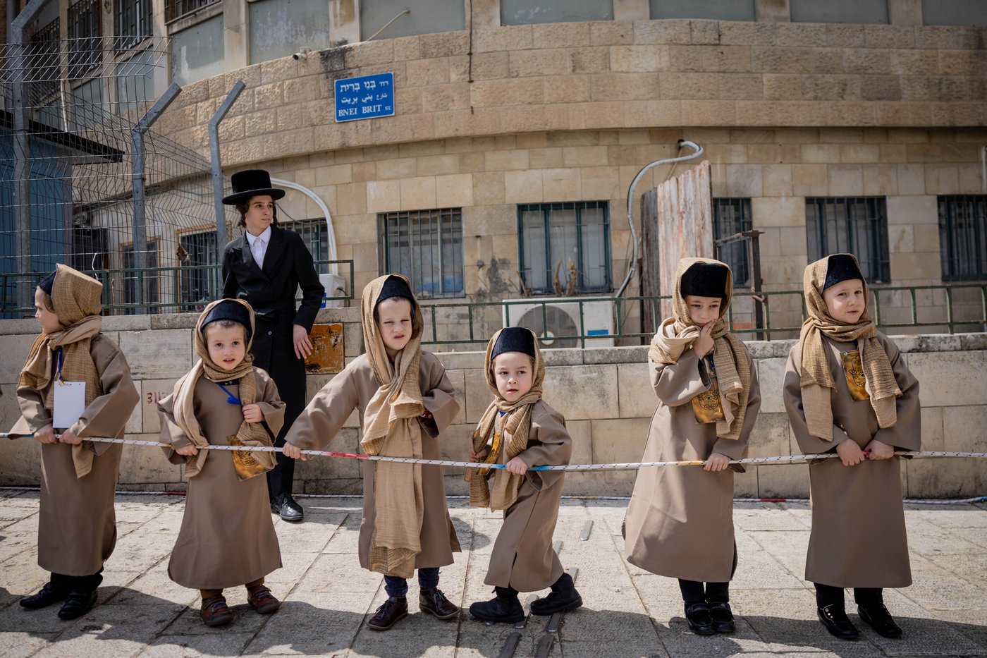 עם חן יהודי נסוך על פניהם, צעדו ילדי תלמוד תורה באיאן באזור כיכר השבת בירושלים, לבושים בתחפושת ייחודית ומקורית, המלבוש המיוחדת למקובלים מדורי דורות.