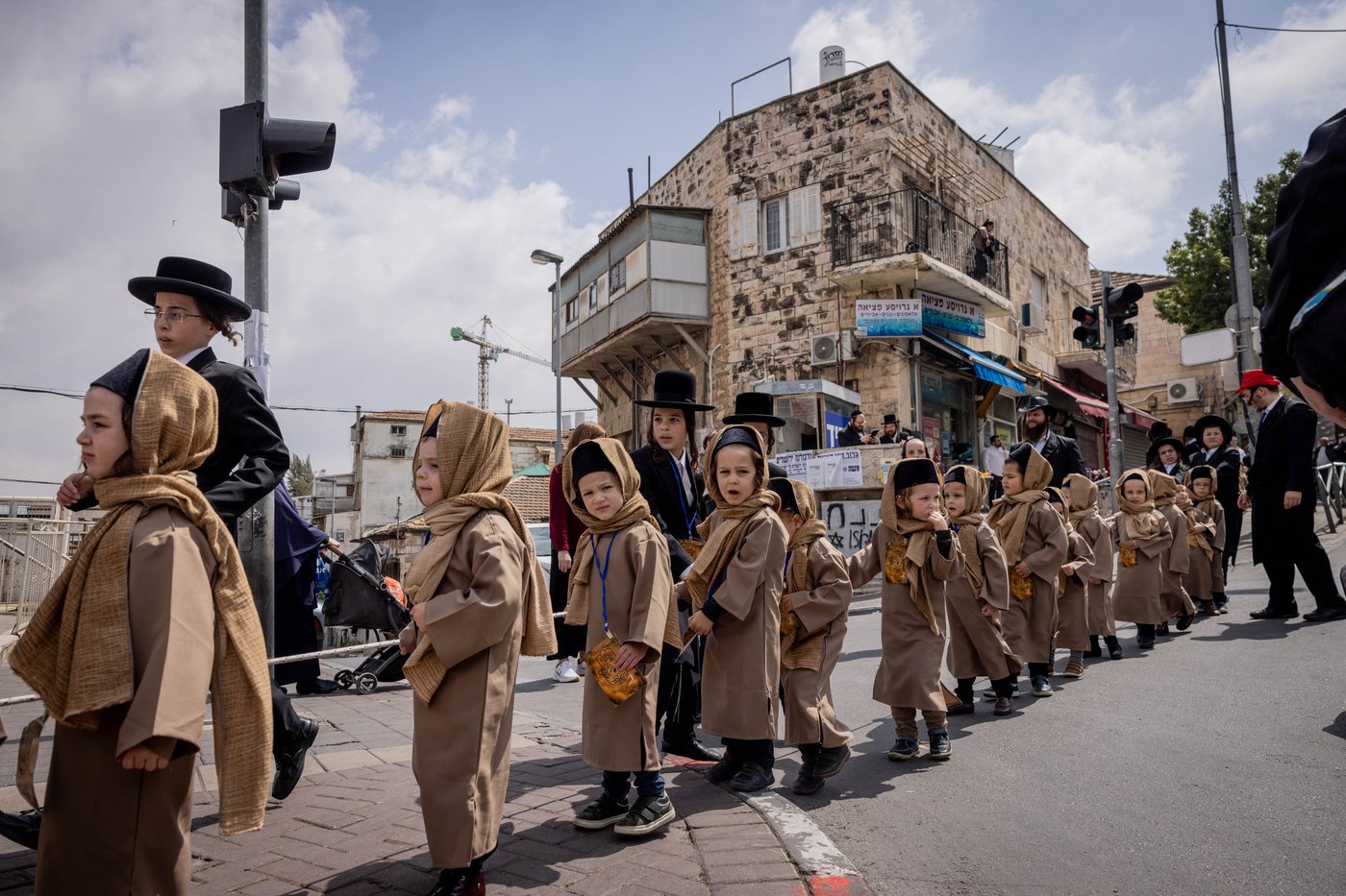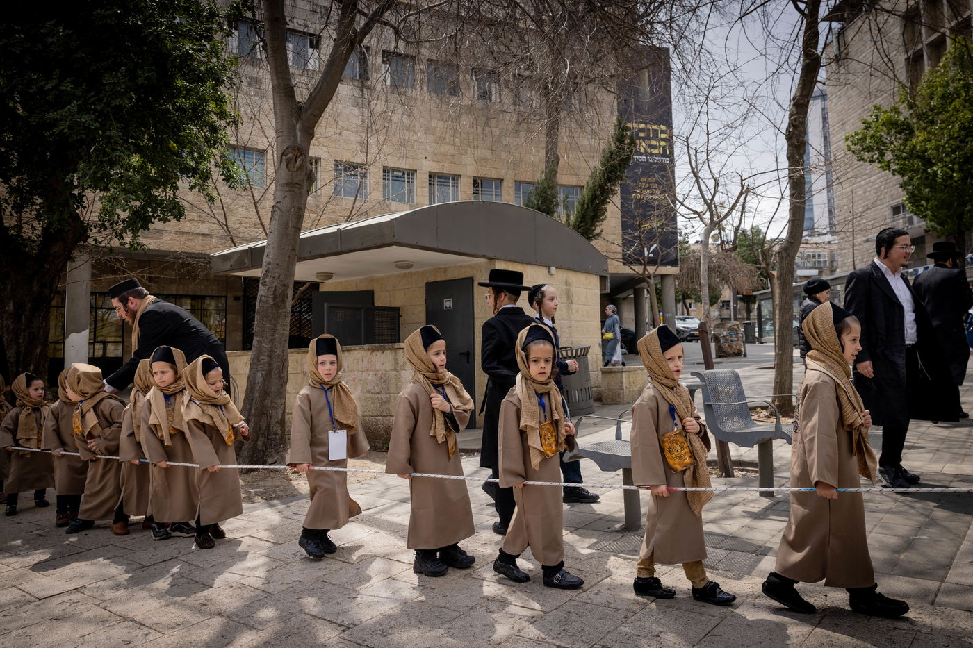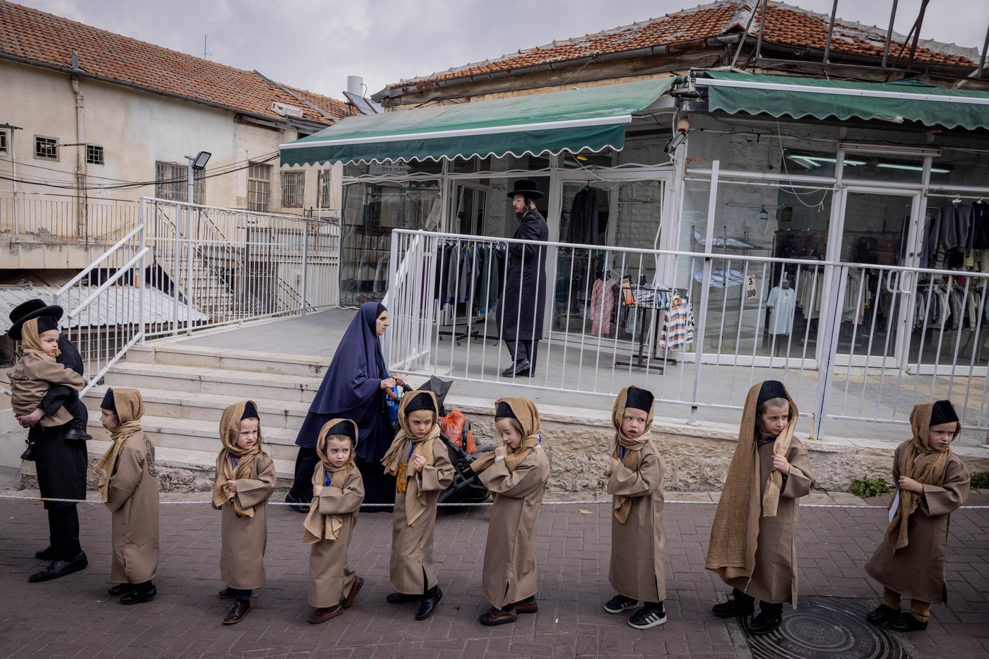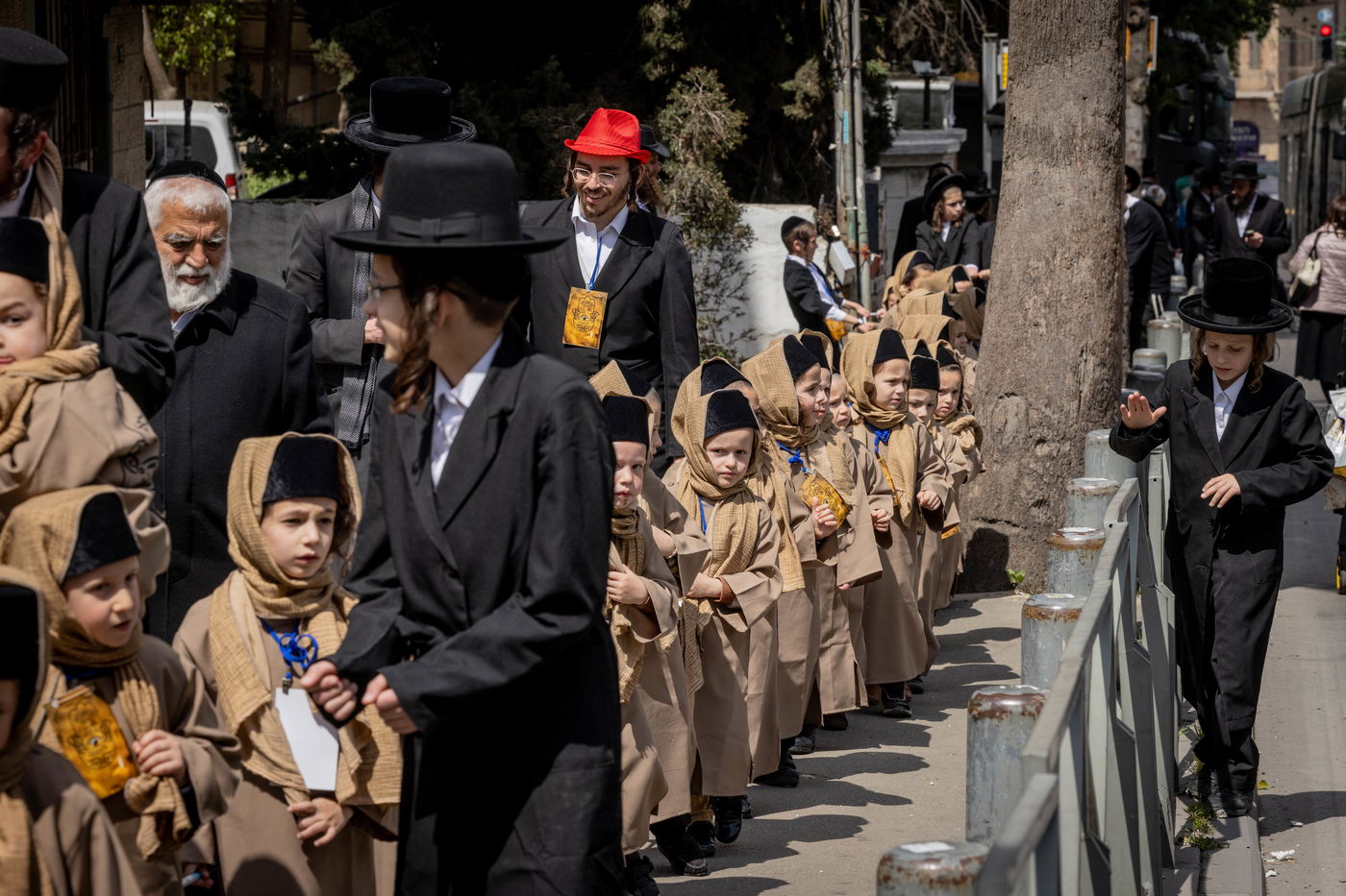 עם חן יהודי נסוך על פניהם, צעדו ילדי תלמוד תורה באיאן באזור כיכר השבת בירושלים, לבושים בתחפושת ייחודית ומקורית, המלבוש המיוחדת למקובלים מדורי דורות.
