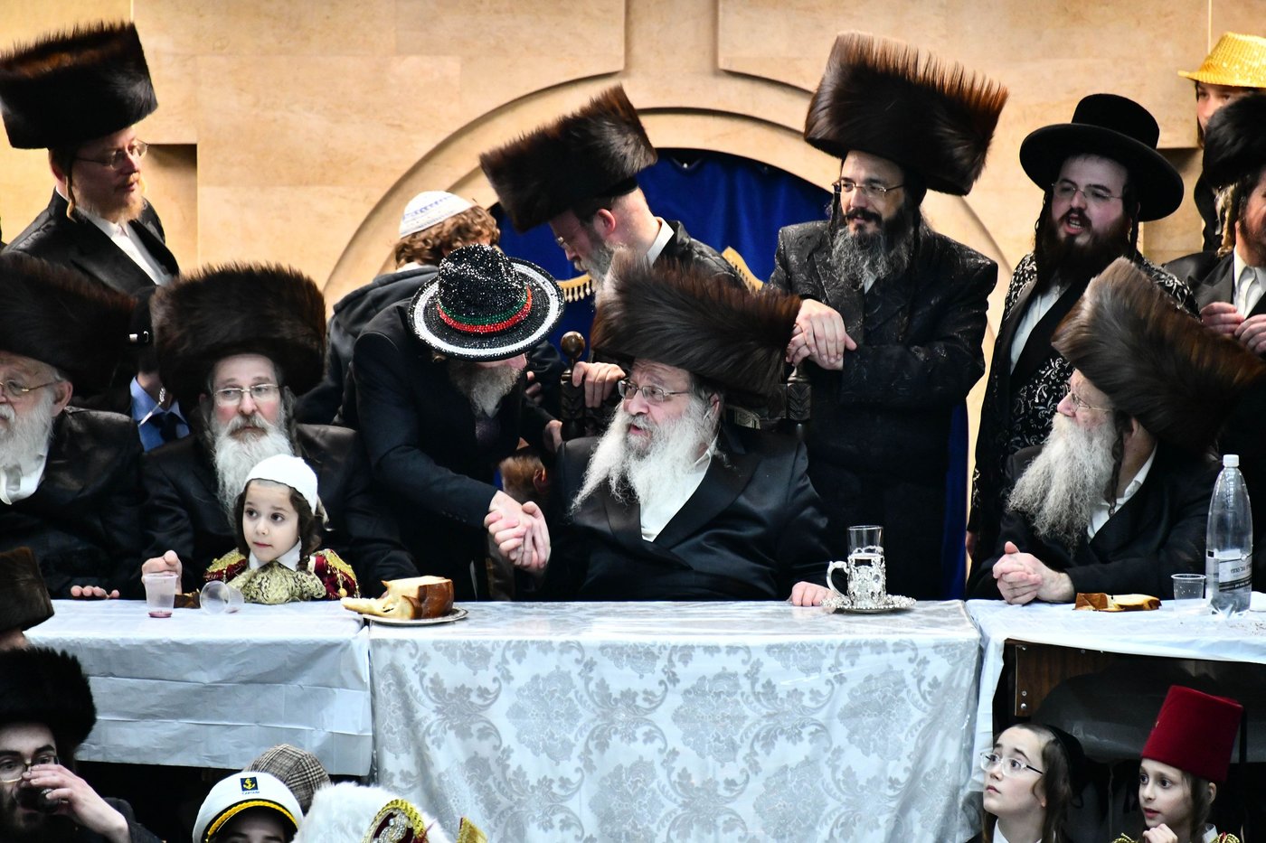האדמו"ר מנדבורנה בעריכת טיש פורים בהיכל הטישים בחצר הקודש | במהלך הטיש קרא האדמו"ר פתקאות מהחסידים והאציל עליהם ברכתו, וכן הפורים רב אמר את הדרשת פורים כנהוג בחצרות הקודש | צפו בגלריה (חסידים)