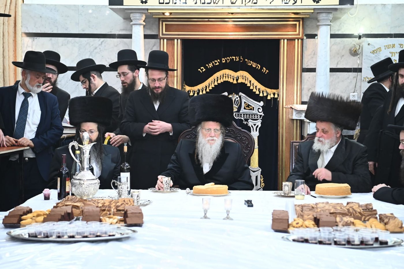 בסנדקאות כובד הסבא רבא האדמו"ר ממודז'יץ, ובאמירת הברכות הסב האדמו"ר מלעלוב בית שמש.