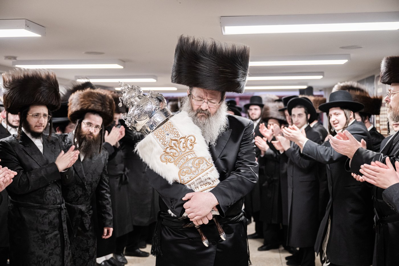 הכנסת ספר התורה יצאה מביתו של הנגיד הרב אברהם ברוך ראזנבערג, מחשובי קהל המתפללים בבית המדרש, ובמהלך התהלוכה נטלו חלק רוב אדמור"י העיר שבאו לשוש ולשמוח בשמחת התורה.
