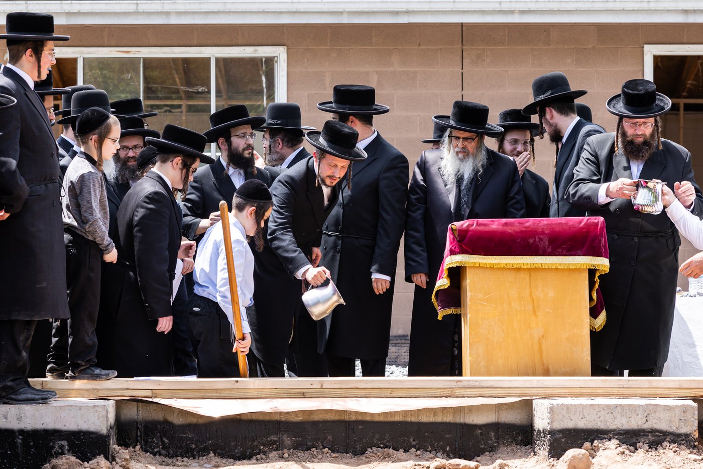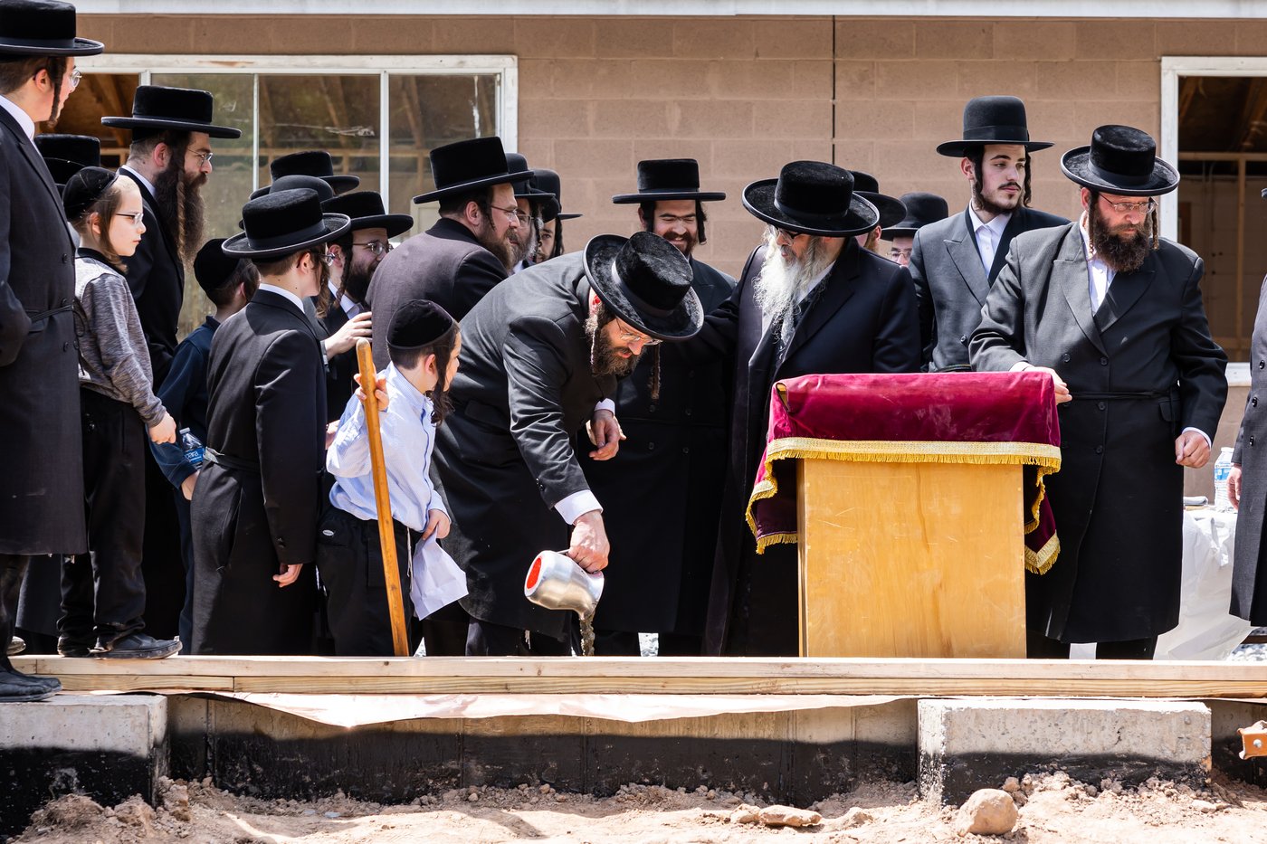 מול עיני הבחורים יצק האדמו"ר מלט אל תוך אמת יסודות הבנין החדש