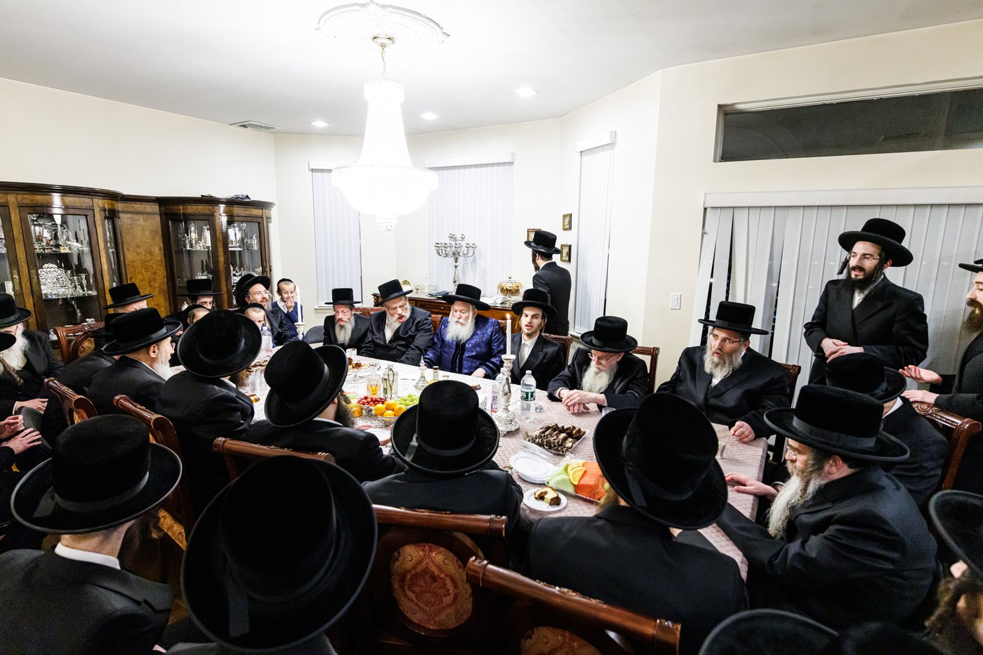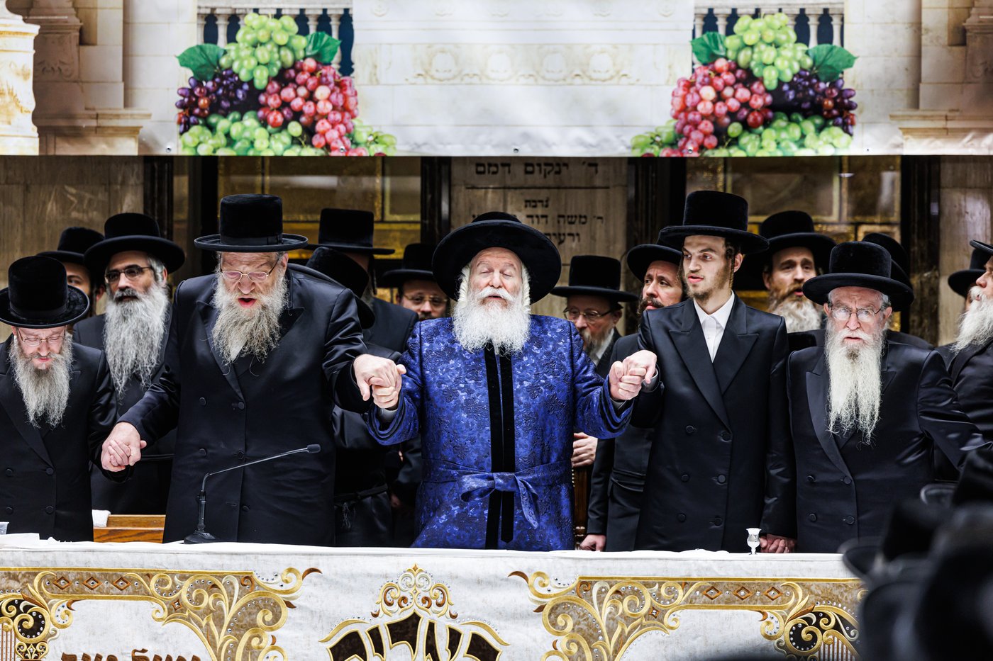 בהמשך עבר האדמו"ר עם בני המשפחה אל עבר ביהמ"ד הגדול שם עברו אלפי החסידים לברכת מזל טוב קדם המחותנים הרמים.