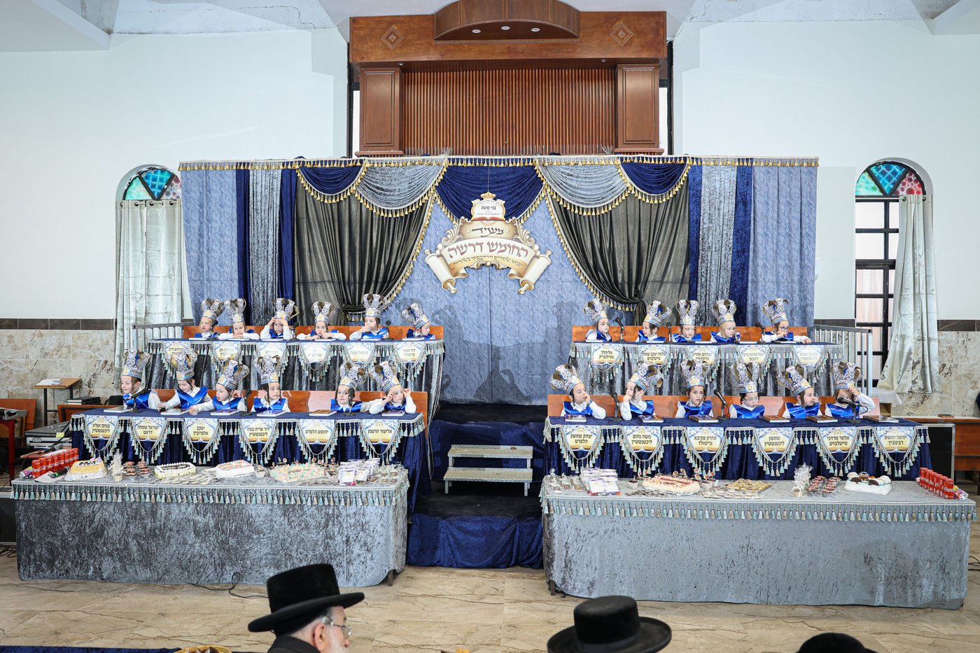 בביהמ"ד הגדול קרעטשניף ברחובות נחוגה ברוב פאר והדר מסיבת חומש לילדי ה'תלמוד תורה' | את המעמד פיאר הופעתו הכבודה הגה"צ רבי דוד משה רוזנבוים אב"ד קרעטשניף | מקהלת ילדי החיידר הנעימו בזמר ושיר במהלך המסיבה (חסידים)