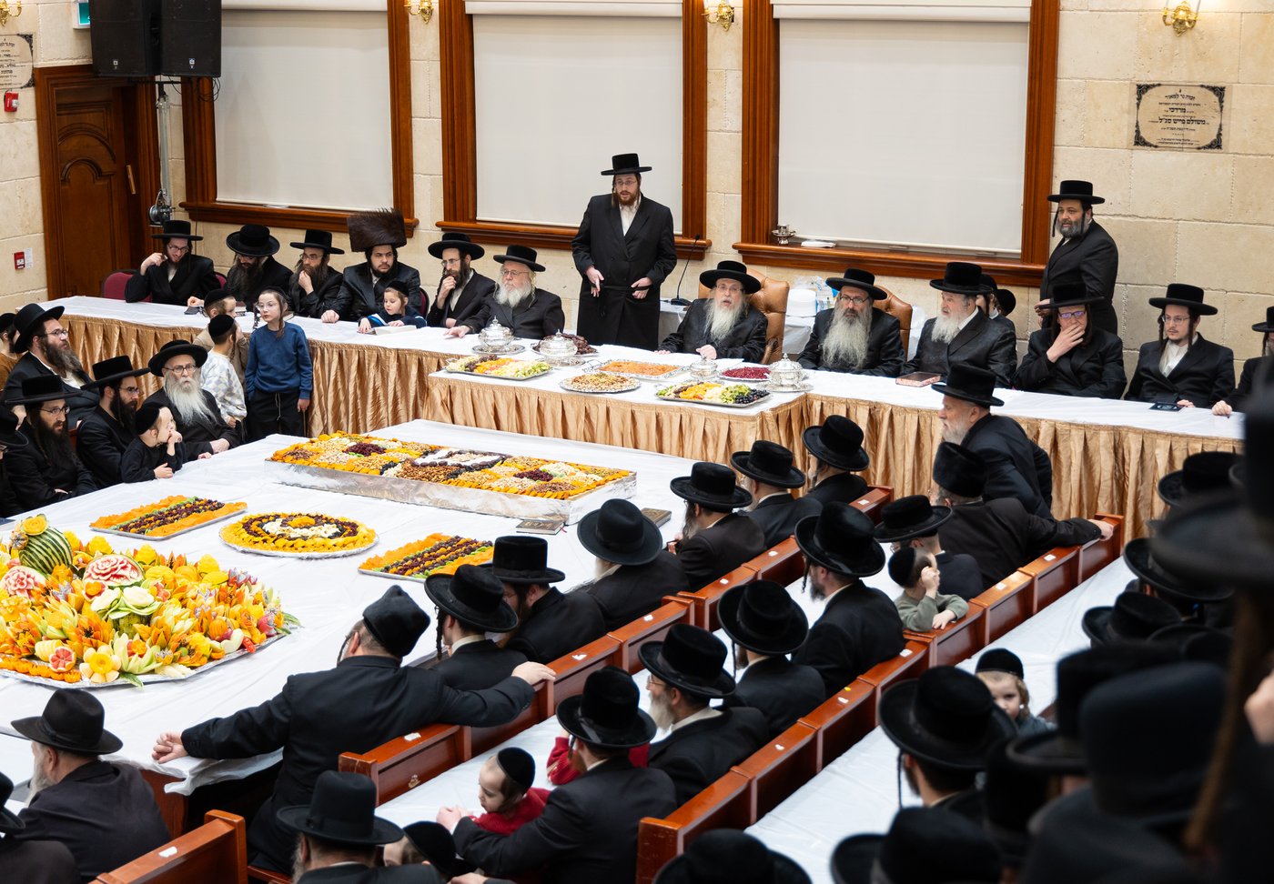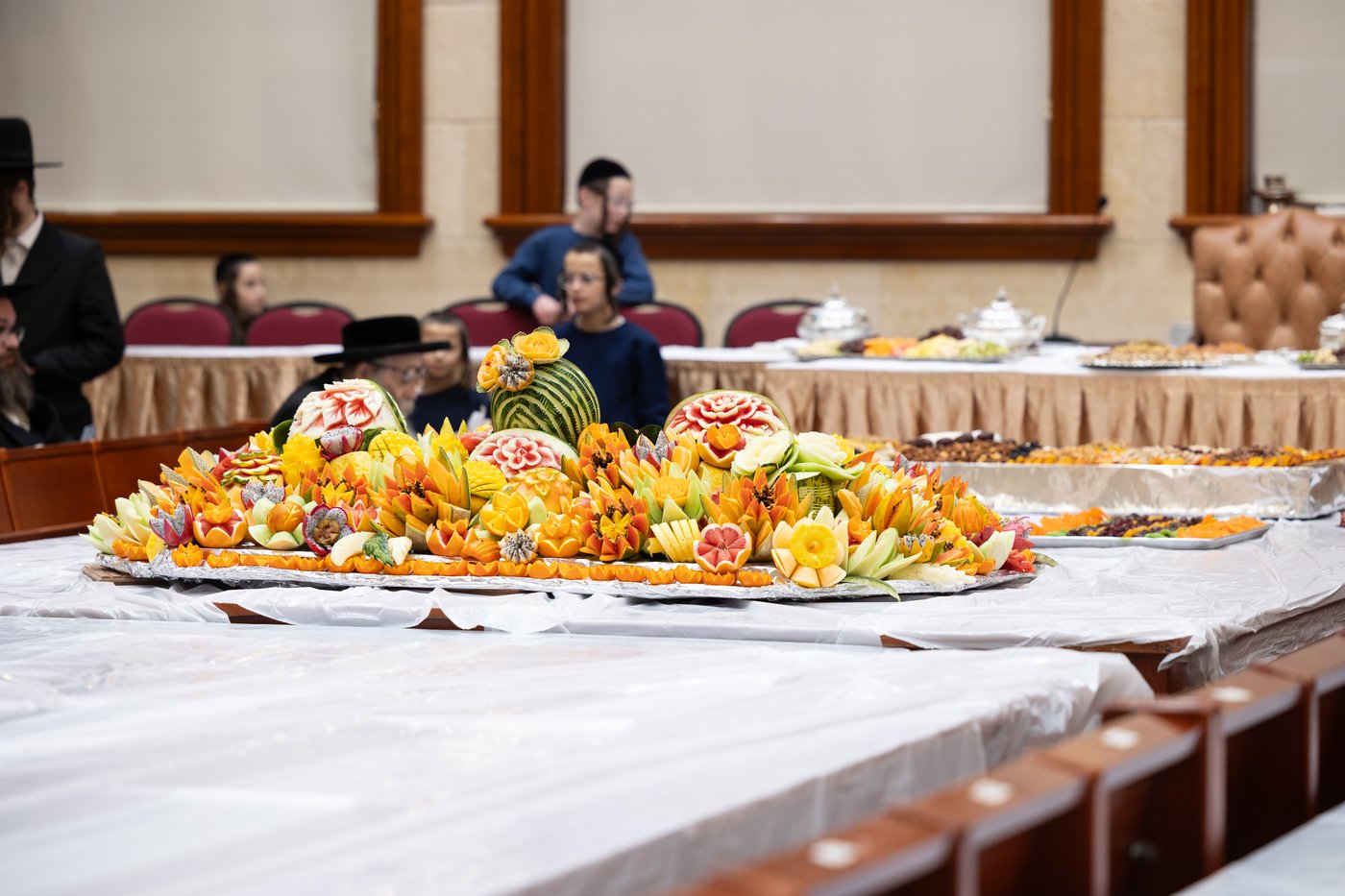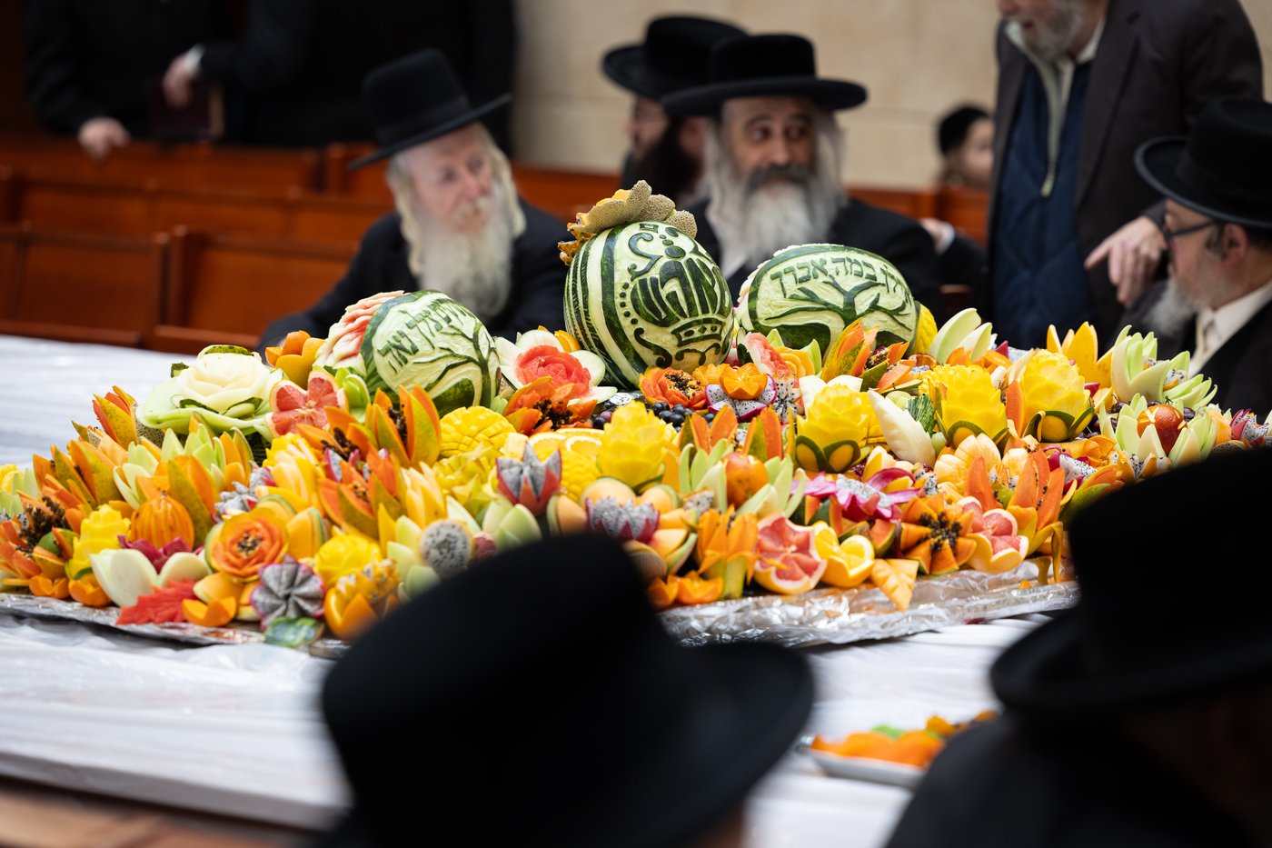 כששולחנו עמוס לעייפה מפירות העונה וכלי כסף לרוב, ערך האדמו"ר מטאהש את שולחנו הטהור לכבוד ט"ו בשבט בהיכל בית מדרשו בשיכון טאהש שבקנדה המושלגת בימים אלו | בסיום הטיש עברו החסידים לפני האדמו"ר שהעניק לכל אחד ואחד צלוחית ממרקחת אתרוגים ועוד פירות לברכה | צפו בתיעוד