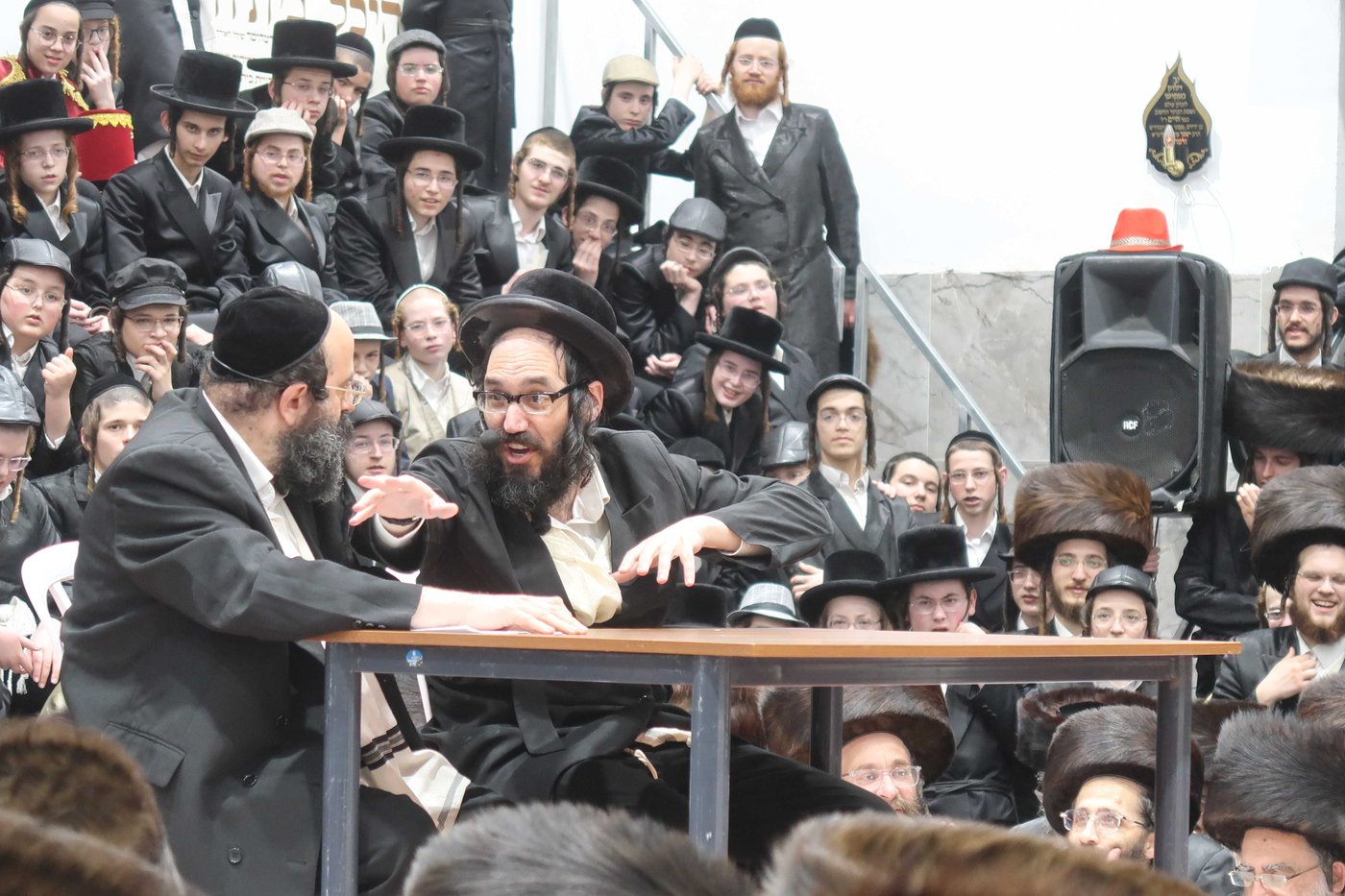 בין לבין עלו על השולחן ה'פורים רב' ר' ירמיהו צין, וה’פורים רבי’ ר' יעקב ראובן לרנר, והמשמש בצדיקים ר' חיים מאיר אדלר ושימחו את הקהל, לאחר מכן נערך ה'פורים שפיל' ע"י ’בדחנא דמלכא’ ר' מאיר שטין ור' מרדכי צין, כנהוג בחצרות חסידים ואנשי מעשה, כשהמציגים הציגו בנושא אמונה ובטחון.