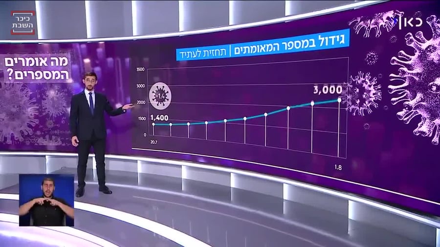על פי הדיווח הערב (רביעי) ב'כאן חדשות', תחזית ההדבקה כפי שקורה עד היום, היא שבכל תשעה ימים מספר המאומתים מכפיל את עצמו, לפי זה בתחילת אוגוסט נגיע ל-3,000 מאומתים ביום, מדובר בתחזית מדאיגה, במיוחד לאור הדיווחים על ירידה ביעילות החיסון.