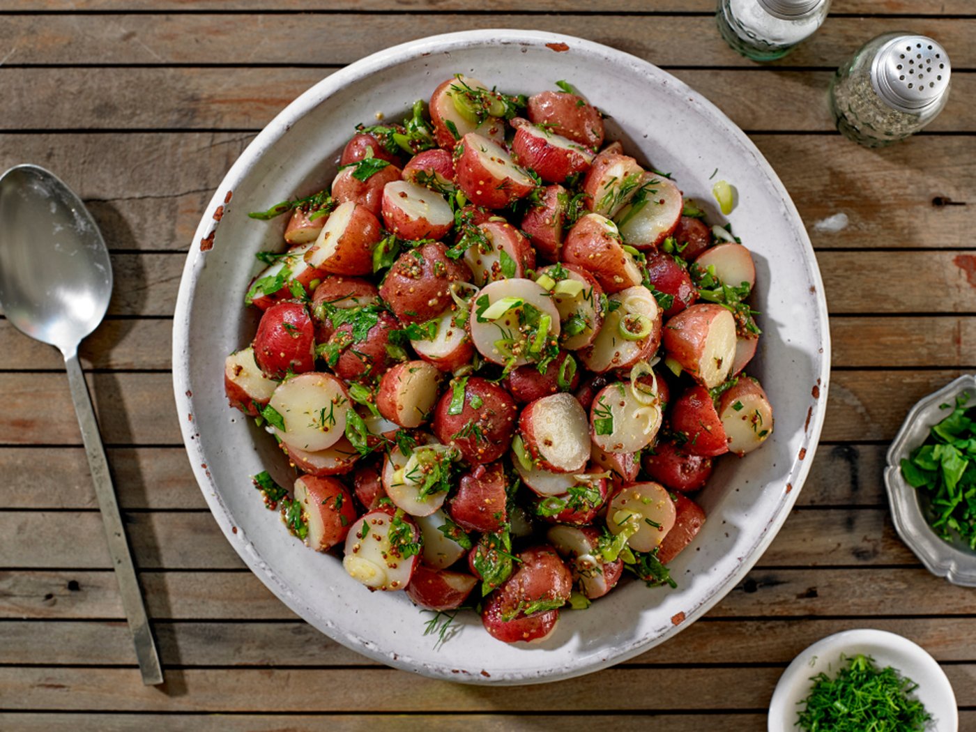 קבלו שדרוג מדהים לסלט תפוחי אדמה הקלאסי: תוספת של רוטב ויניגרט חרדל עם בצל ירוק ועשבי תיבול - והוא נהיה טעים יותר אחרי כמה שעות במקרר, מה שהופך אותו לסלט המושלם לשבת. מגישים קר או בטמפרטורת החדר.
