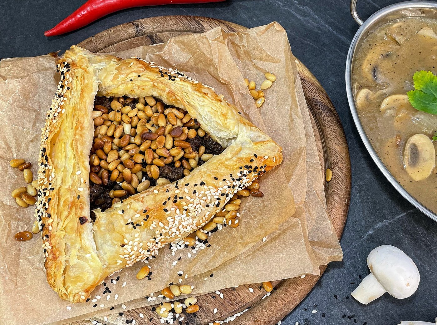 עלי פילאס קריספיים שעוטפים מילוי אקסטרה עסיסי של בשר ופטריות, לצד רוטב פטריות סמיך וטעים שאסור לוותר עליו. מאפה נהדר בצורה שמזכירה "אוזן המן" ענקית שכיף להגיש לצד המנה העיקרית בשולחן השבת.